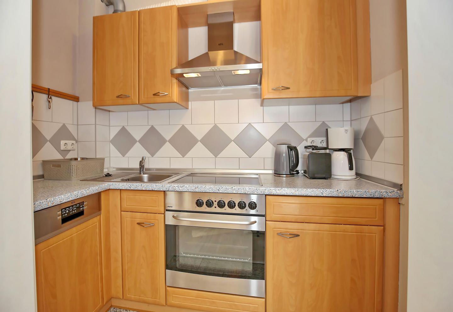 Die Küchenzeile ist für dich gut ausgestattet. Zur Kücheneinrichtung gehören ein Kühlschrank mit Gefrierfach, ein 4-Ceran-Kochfeld, Backofen, Geschirrspüler sowie Wasserkocher, Toaster und Kaffeemaschine.