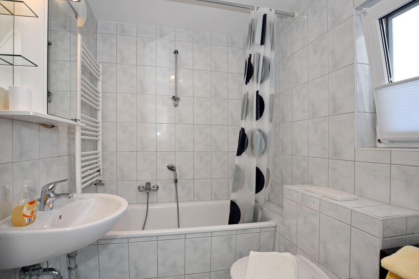 Die Ferienwohnung verfügt über ein Wannenbad mit WC sowie einen Föhn. Im Wohn-, Schlaf- und Essbereich wurde Laminat verlegt und die Küche sowie das Wannenbad sind gefliest.