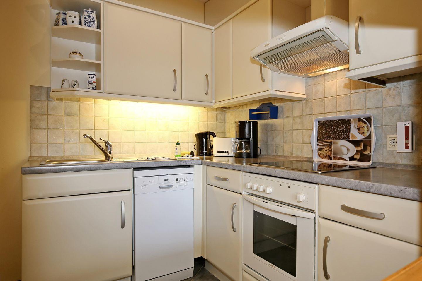 Die Küche der Ferienwohnung verfügt für dich über einen Wasserkocher, eine Kaffeemaschine, einen Geschirrspüler, einen Backofen, einen Kühlschrank mit Gefrierfach, einen Toaster sowie eine Mikrowelle. Zum Kochen ist ein 4-Platten-Cerankochfeld vorhanden.