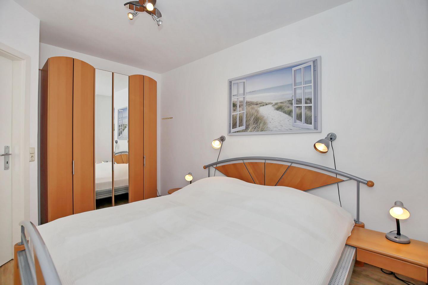 Im ersten Schlafzimmer dieser Ferienwohnung lädt ein Doppelbett (2 x 90 x 200 cm) zum erholsamen Schlaf ein. Ein großer Kleiderschrank bietet viel Stauraum. Im zweiten Schlafzimmer befindet sich ein Etagenbett (je 90 x 200 cm) und ein Kleiderschrank. (Die Schlafzimmerfenster beider Schlafzimmer gehen zum Atrium raus). In beiden Schlafzimmern dienen Vorhänge zur Verdunkelung.