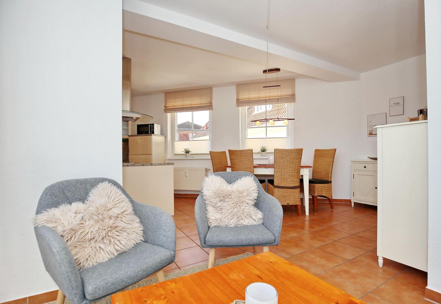 Im Wohnbereich steht dir ein Schlafsofa zur Verfügung, das mit wenigen Handgriffen zum Schlafplatz für 2 Personen wird, sowie zwei Sessel. Unterhaltung bietet ein Flachbild-Fernseher an der Wand. WLAN steht dir kostenfrei zur Verfügung. Der Esstisch für 4 Personen bietet genügend Platz für gemeinsame Mahlzeiten, die du in der angrenzenden gut ausgestatteten Küchenzeile zubereiten kannst. Neben einem Backofen, 4-Platten-Cerankochfeld, Kühlschrank mit Gefrierfach, Geschirrspüler und Kaffeemaschine wurde auch an einen Toaster, einen Wasserkocher und eine Mikrowelle für die perfekte Ausstattung der Küche gedacht.