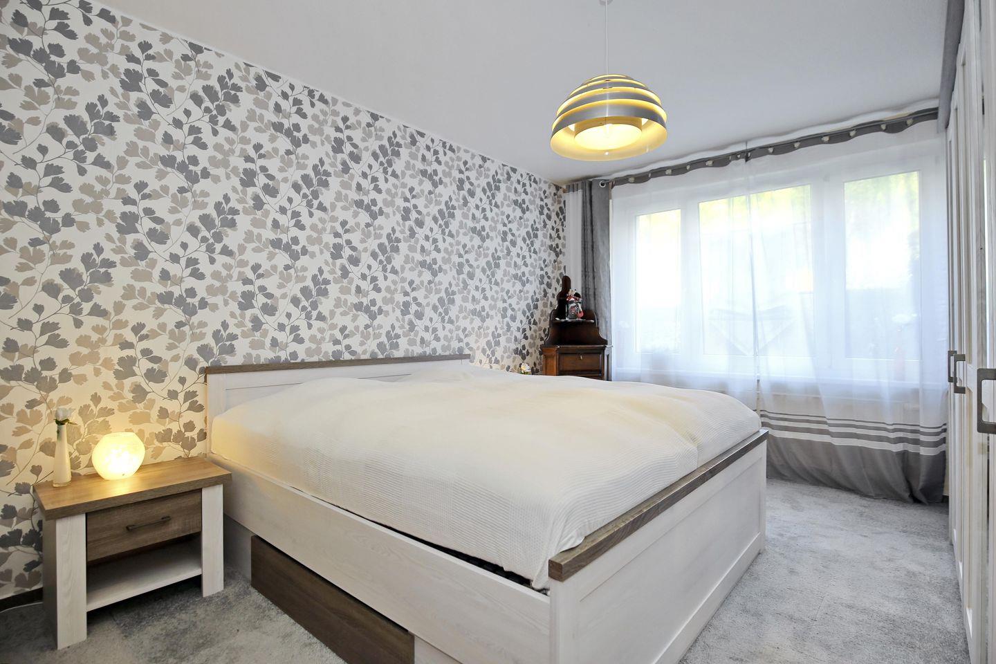 Das Tageslichtbad ist mit einer Badewanne und einem WC ausgestattet. Ebenso findest du einen Spiegel, ein Regal und einen Handtuchheizkörper vor. An den Fenstern sind Rollos als Sichtschutz angebracht. Das Bad und der Küchenbereich sind gefliest. Im Wohnbereich und im Flur wurde Vinyl und im Schlafzimmer Teppich verlegt.