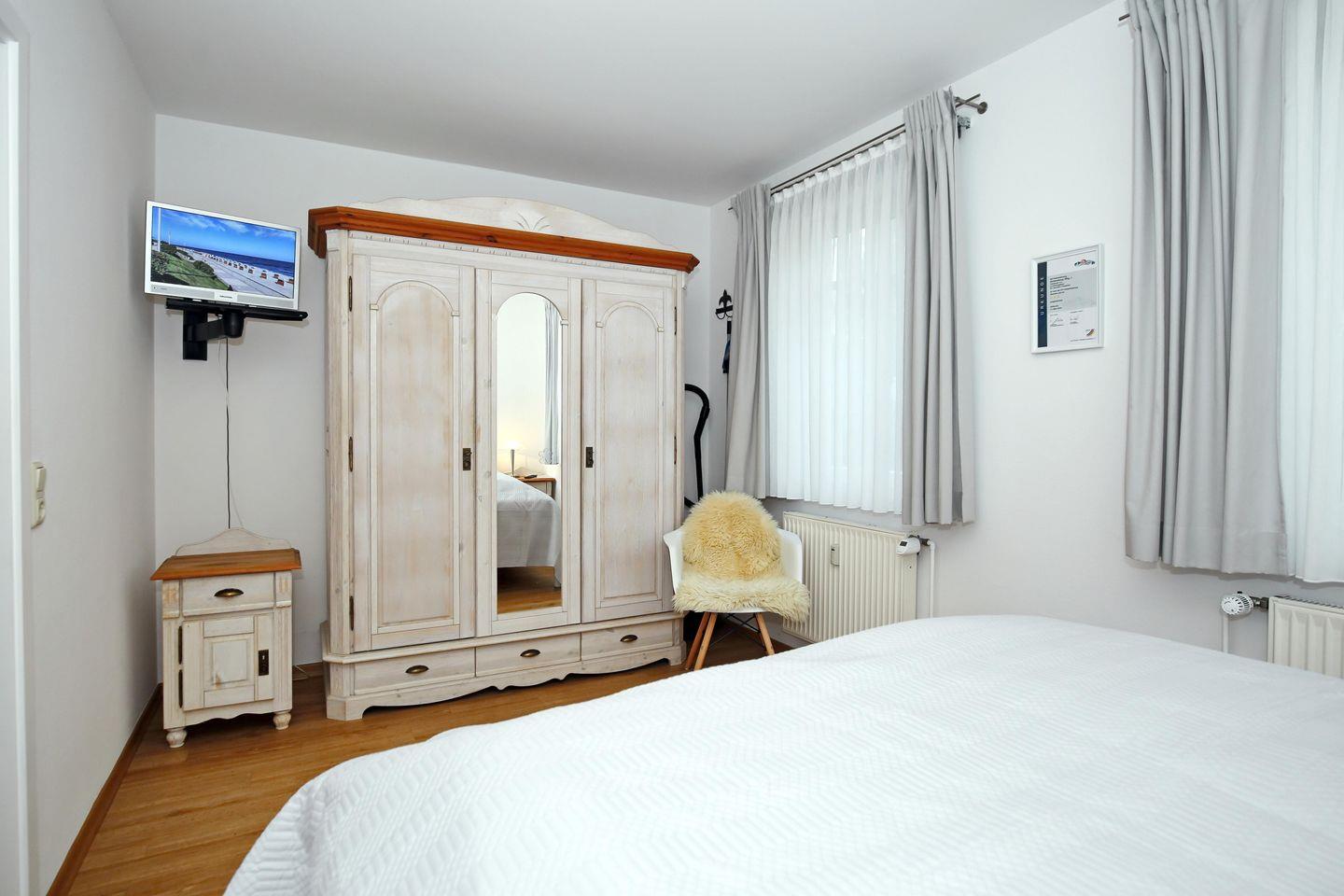Das Schlafzimmer lädt dich mit einem bequemen Doppelbett (2 x 80 x 200 cm) zur erholsamen Nachtruhe ein. Ein Kleiderschrank bietet dir hier Stauraum für dein Urlaubsgepäck, ein zweites TV-Gerät steht hier für deinen Komfort zur Verfügung. Im Wohnbereich wird das Sofa (120 x 200 cm) schnell zu einem bequemen Schlafplatz für die dritte Person.