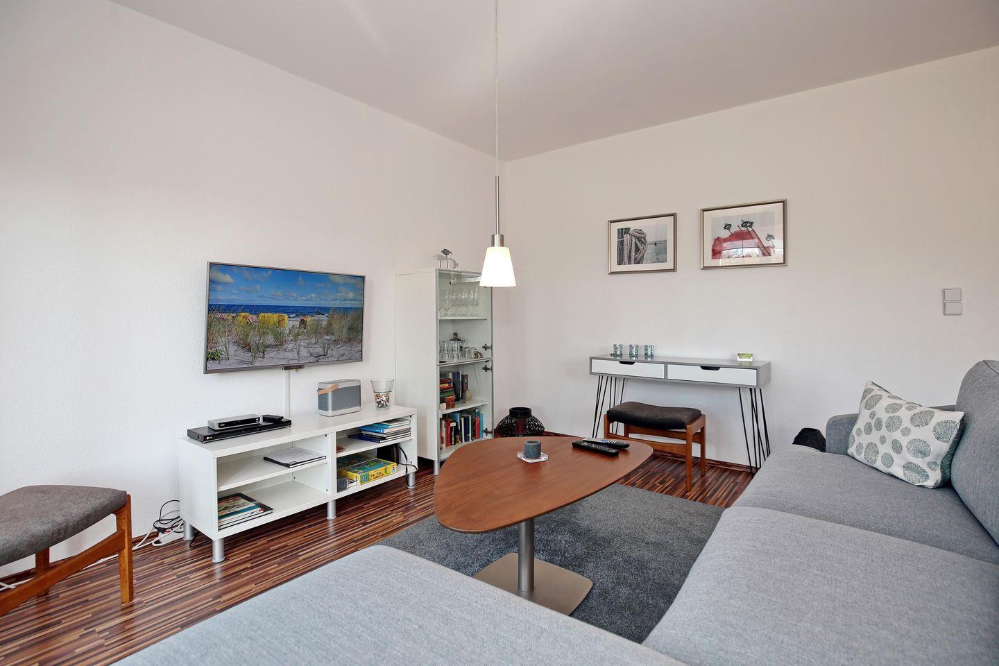 Im Wohnraum der Ferienwohnung warten auf dich eine gemütliche Couch, sowie ein moderner Flachbild-TV. Am Esstisch hast du genügend Platz für gemeinsame Mahlzeiten.