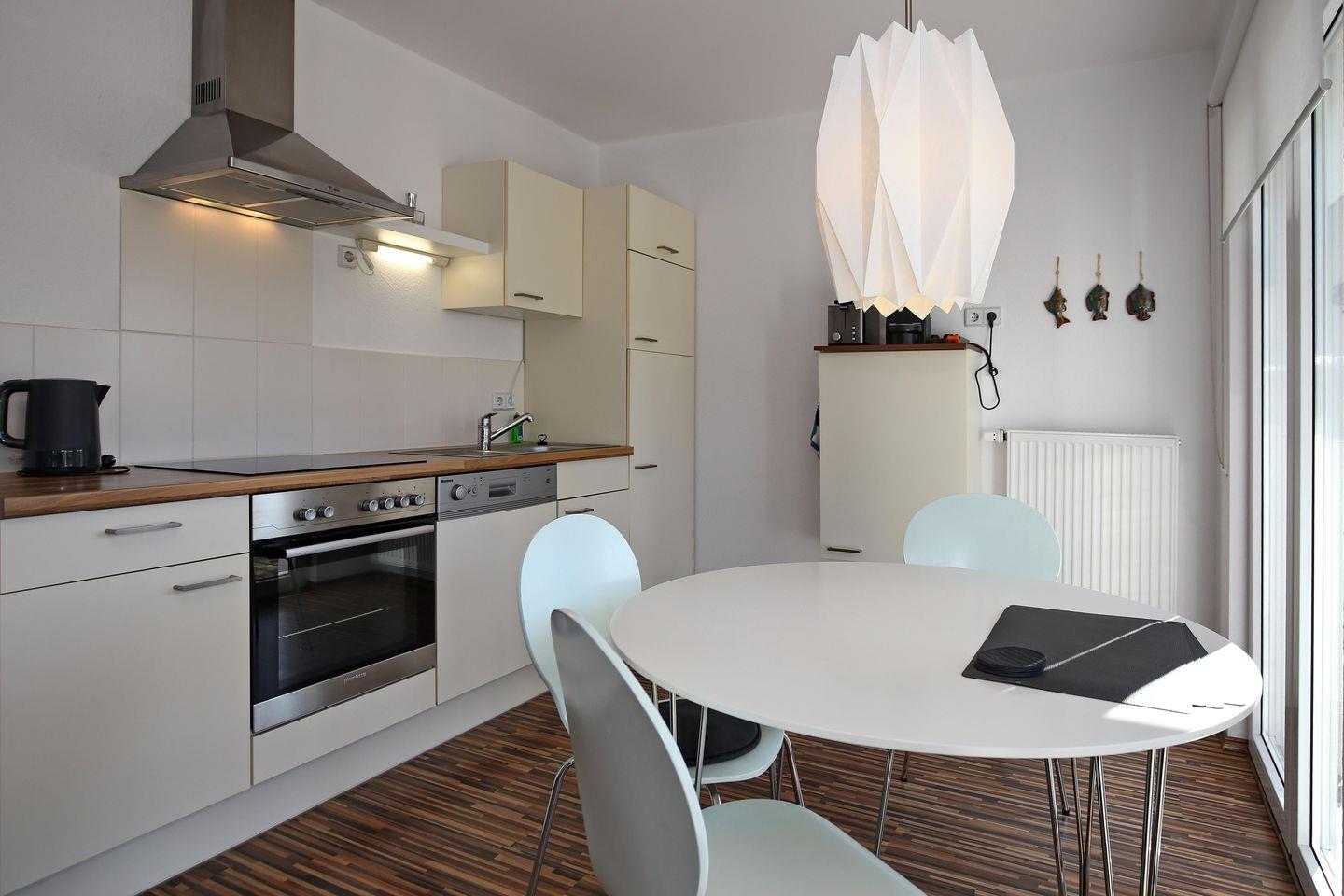 Die offene Küchenzeile ist mit einem Kühlschrank mit Gefrierfach, einem Geschirrspüler, einem 4 Platten Cerankochfeld und einem Backofen ausgestattet. Natürlich stehen dir ein Toaster, ein Wasserkocher, eine Kaffeemaschine und Nespressomaschine zur Verfügung. Von hier aus kommst du auf die möblierte Südterrasse mit Blick in den Garten.