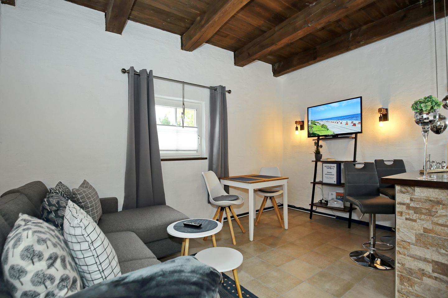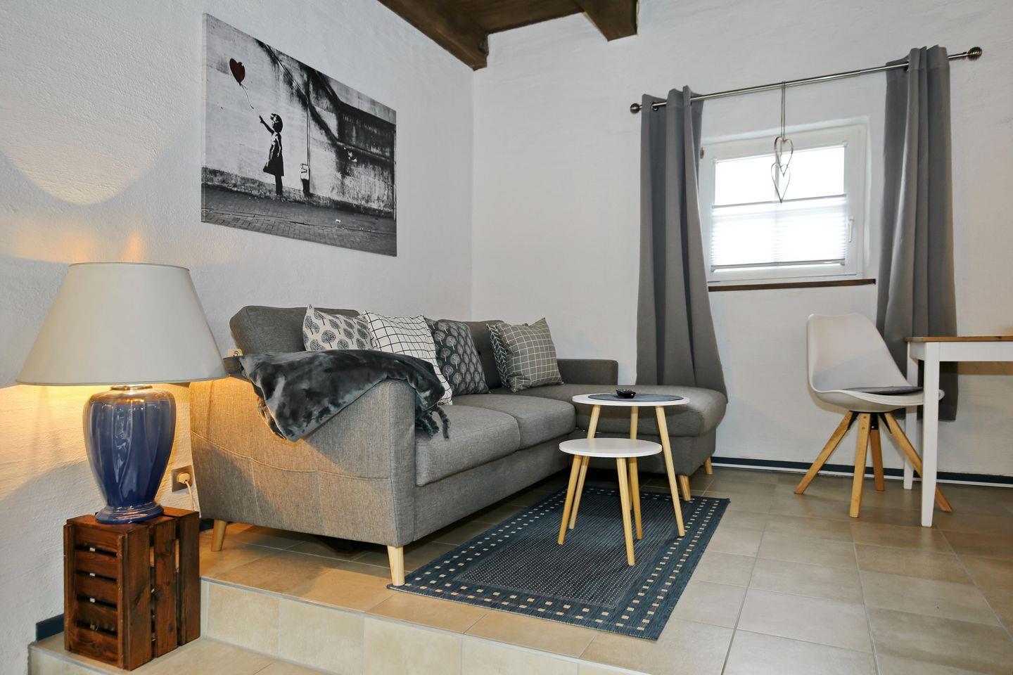Der Wohnbereich der Ferienwohnung lädt zum Verweilen ein. Ausgestattet mit einer Couch, einem Sessel, einer Stereoanlage sowie einem Flachbild-TV, kannst du hier gesellige Abende verbringen. Der integrierte Essbereich bietet dir die Möglichkeit, gemeinsam eure Mahlzeiten zu genießen.