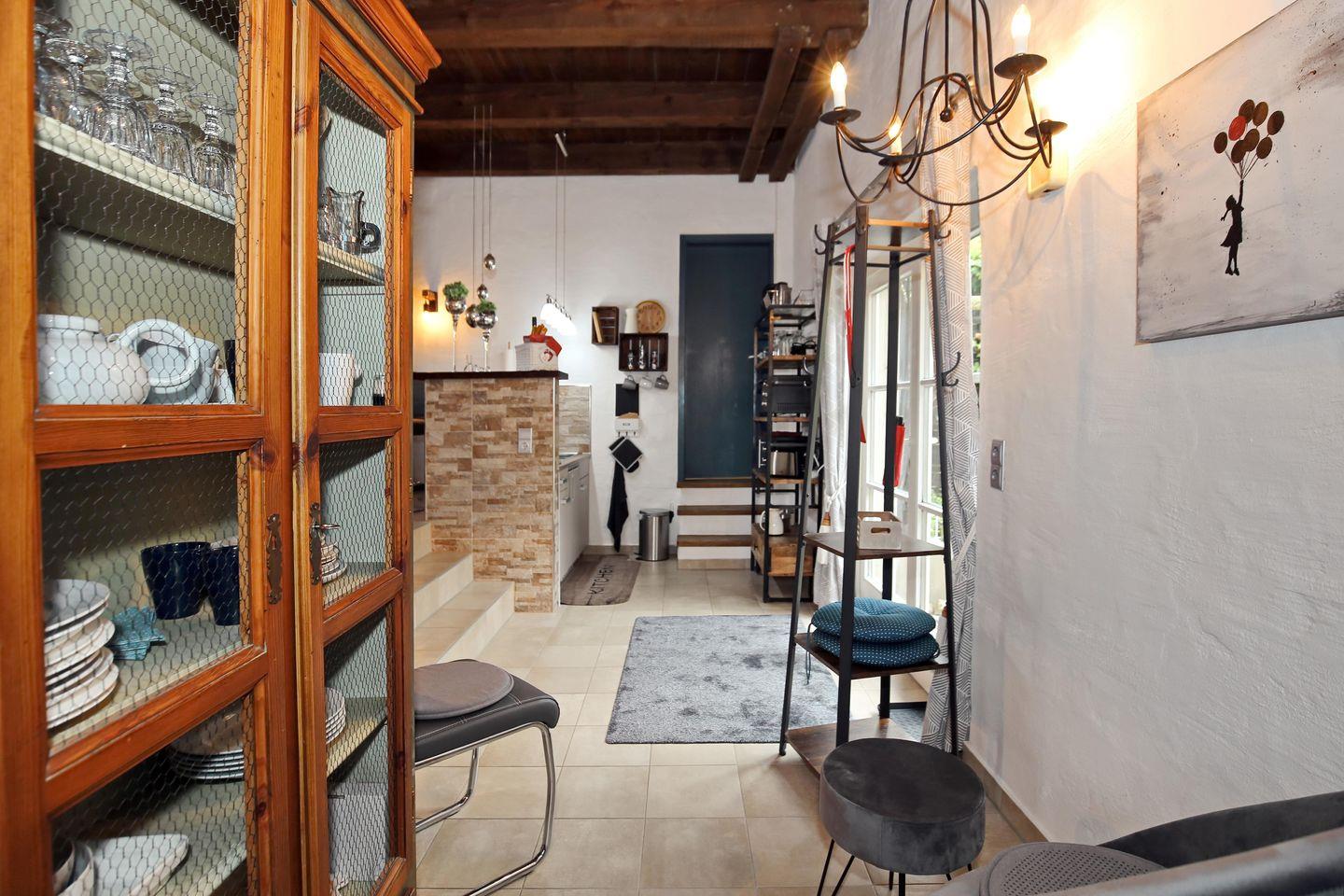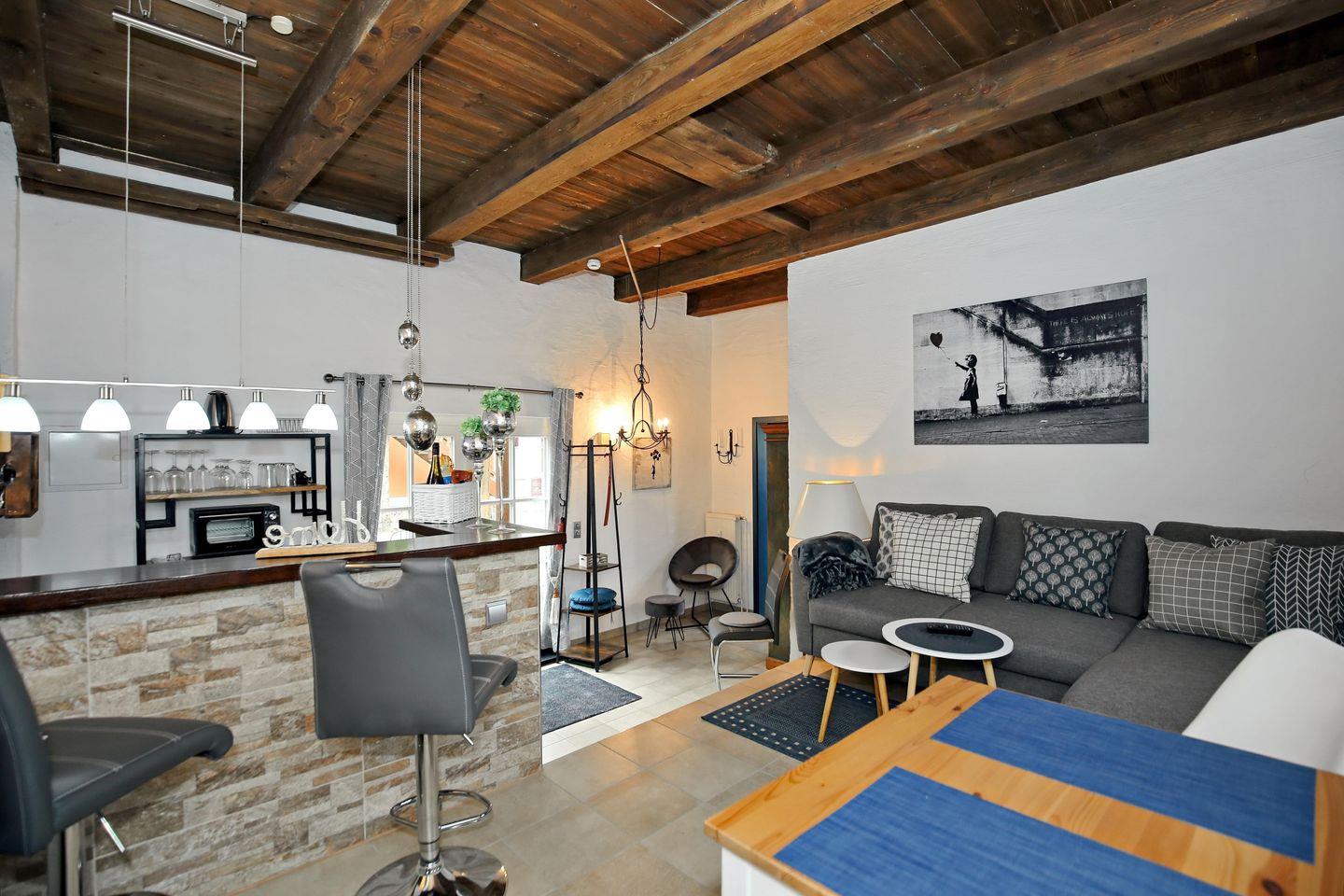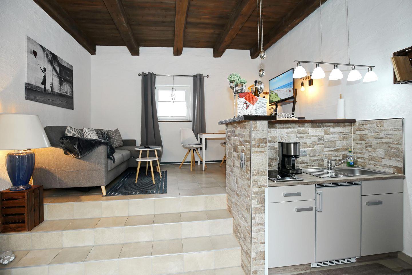 Die 41 m² große Ferienwohnung 14 „Auf den Höfen“ liegt im Erdgeschoss und bietet dir und bis zu 3 weiteren Personen (3 Erwachsene oder 2 Erwachsene + 2 Kinder) Platz für entspannte Tage. Die hölzerne Decke mit den sichtbaren Dachbalken verleiht der Wohnung eine urige Gemütlichkeit. Die Wohnfläche gliedert sich in einen kombinierten Wohn- und Essbereich mit Pantry-Küche, ein Schlafzimmer und ein Duschbad. Auf der kleinen West-Terrasse kannst du schöne Stunden genießen.