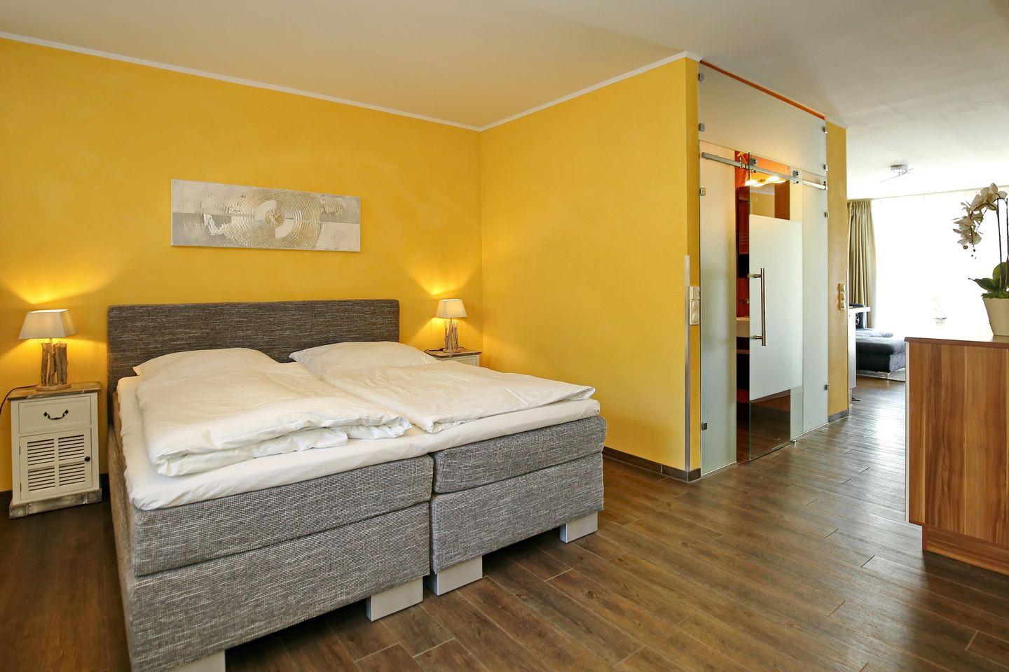 Im offenen Schlafbereich lädt dich ein komfortables Boxspringbett (2 x 90 x 200 cm) zur erholsamen Nachtruhe ein. Die Betten sind für dich bereits bezogen. Der Kleiderschrank bietet dir ausreichend Stauraum für deine Sachen. Als Sichtschutz sind Gardinen und zum Verdunkeln sind Vorhänge am Fenster vorhanden. Ein Plissee an der Wohnungseingangstür dient dir hier als Sichtschutz.