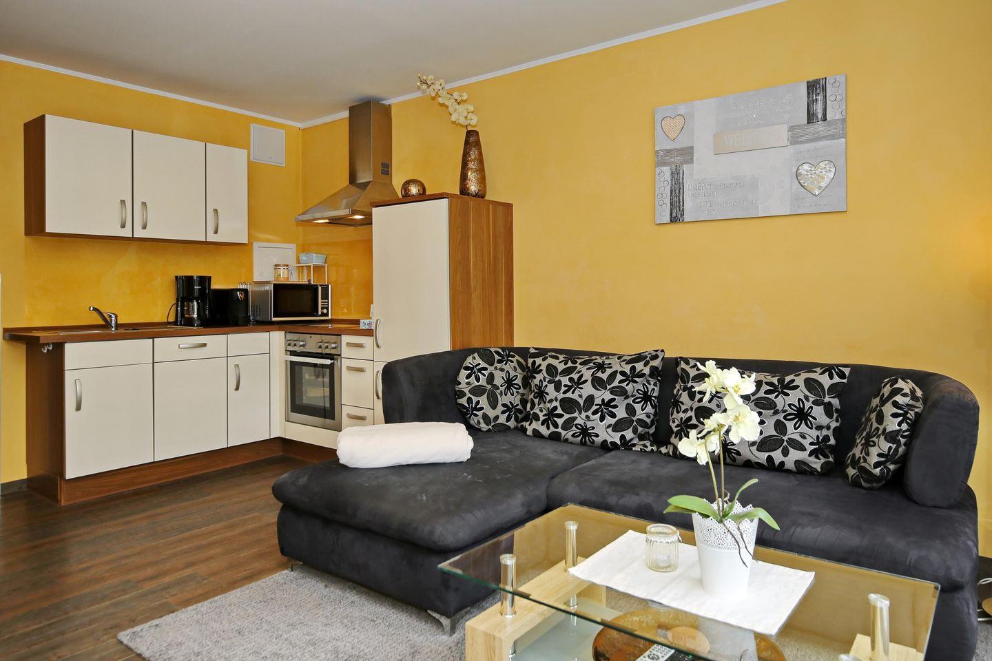 Der Wohnbereich der Ferienwohnung ist für dich mit einem gemütlichen Ecksofa, einem Sessel und einem Couchtisch eingerichtet. Für deine Unterhaltung stehen ein Smart-TV, ein DVD-Player und eine Stereoanlage bereit. Mit wenigen Handgriffen lässt sich das Sofa in einen Schlafplatz für die 3. Person umbauen. Das WLAN nutzt du kostenlos. Der Essbereich ist im Wohnbereich integriert und bietet dir mit einem Tisch und 4 Stühlen viel Platz für deine gemeinsamen Mahlzeiten.