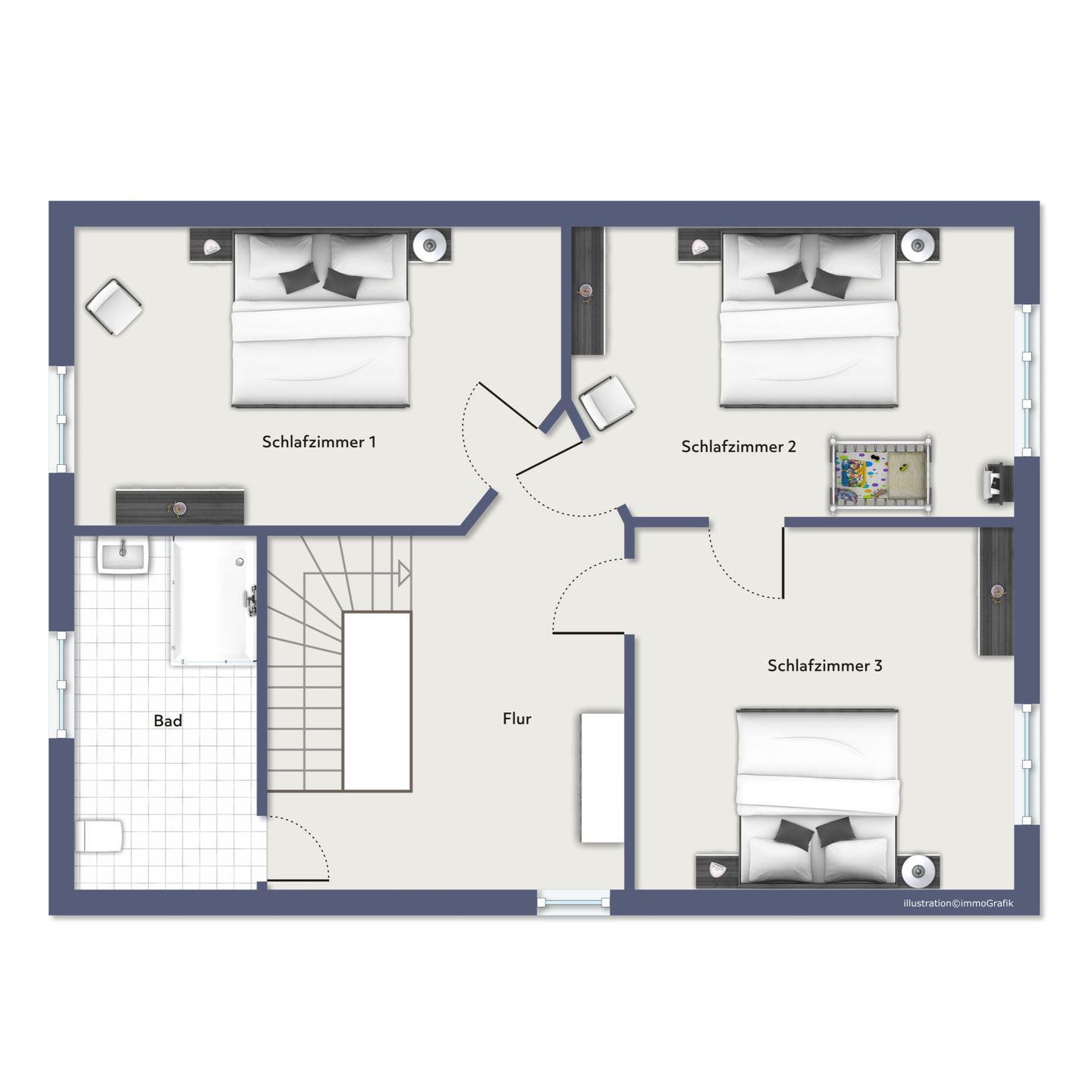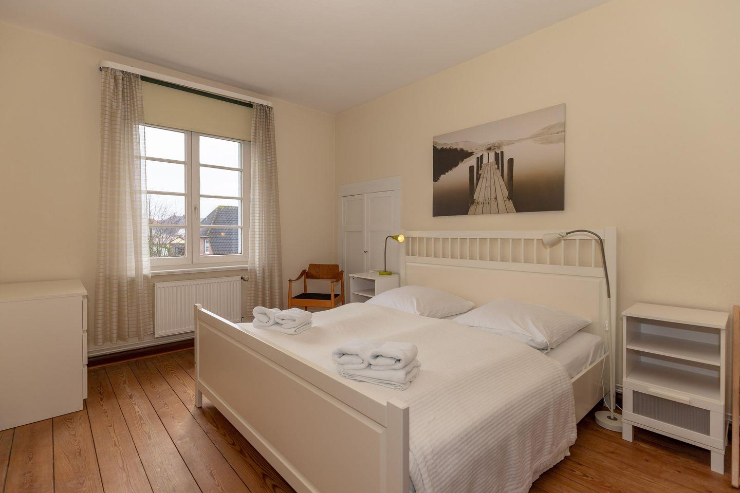 In der oberen Etage befinden sich drei Schlafzimmer. In zwei Schlafzimmern befinden sich Doppelbetten, in dem dritten Schlafzimmer stehen 2 Einzelbetten zur Verfügung. In zwei Schlafzimmern stehen dir integrierte Kleiderschränke zur Verfügung. Zum Verdunkeln kannst du in allen Schlafzimmern Vorhänge oder Rollos nutzen.