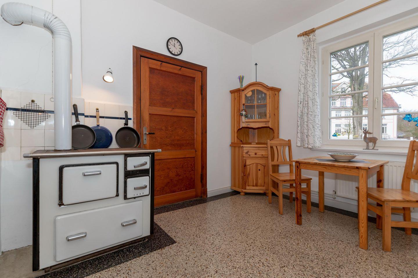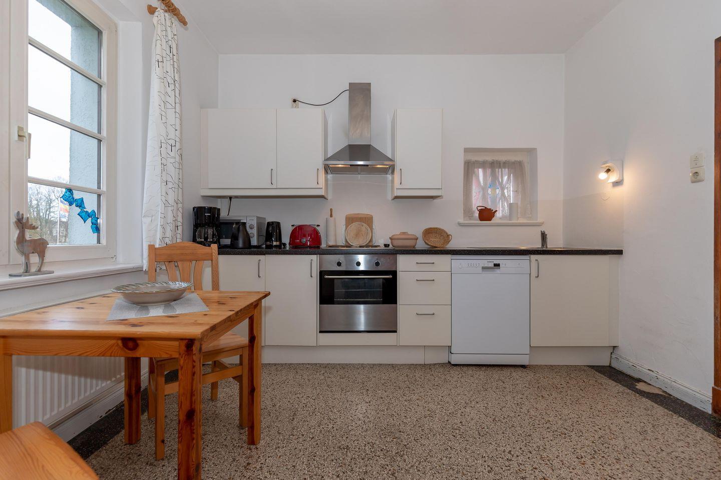 Im Erdgeschoss des Ferienhauses befindet sich der Wohnbereich. Hier laden dich ein Zwei-Sitzer-Sofa und ein Drei-Sitzer-Sofa zu gemütlichen Abendstunden ein. Zur Unterhaltung stehen dir ein Flatscreen-TV, ein WLAN-Anschluss sowie ein Radio bereit. Der Essbereich mit dem historischen Kachelofen ist von der Küche und dem Wohnbereich aus begehbar und bietet dir Platz für gemeinsame Mahlzeiten oder Spieleabende.