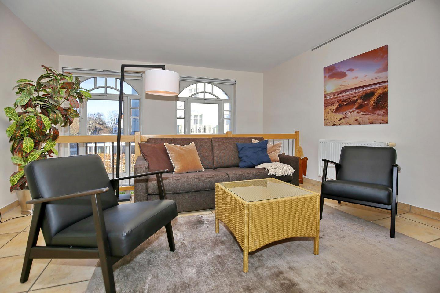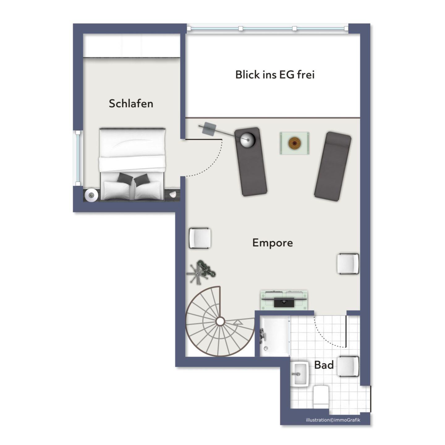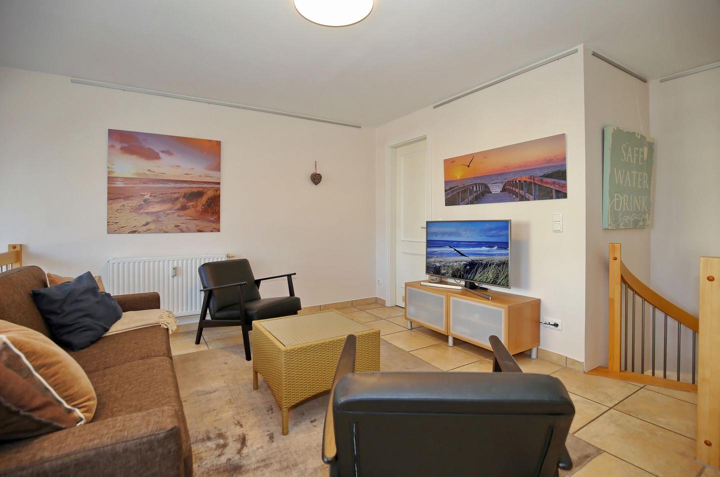 Im Relax-Bereich im 1. Obergeschoss befinden sich eine Schlafcouch und ein Flachbild-TV. Der Fußboden hier ist gefliest.