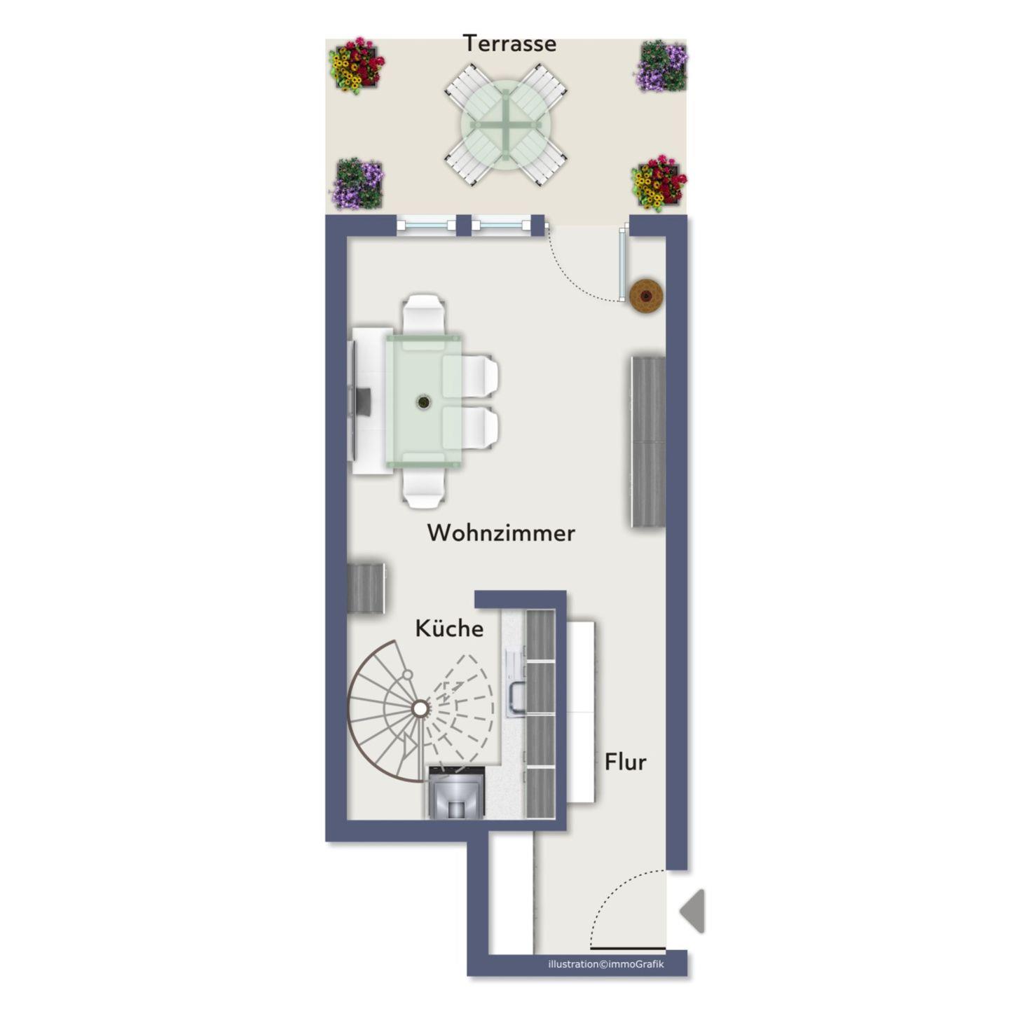 Ebenfalls im Erdgeschoss befindet sich die offene und gut ausgestattete Küchenzeile. Zur Kücheneinrichtung gehören ein Kühlschrank mit Gefrierfach, ein 4-Platten-Cerankochfeld, ein Geschirrspüler, ein Wasserkocher, eine Kaffeemaschine, ein Toaster und eine Mikrowelle.