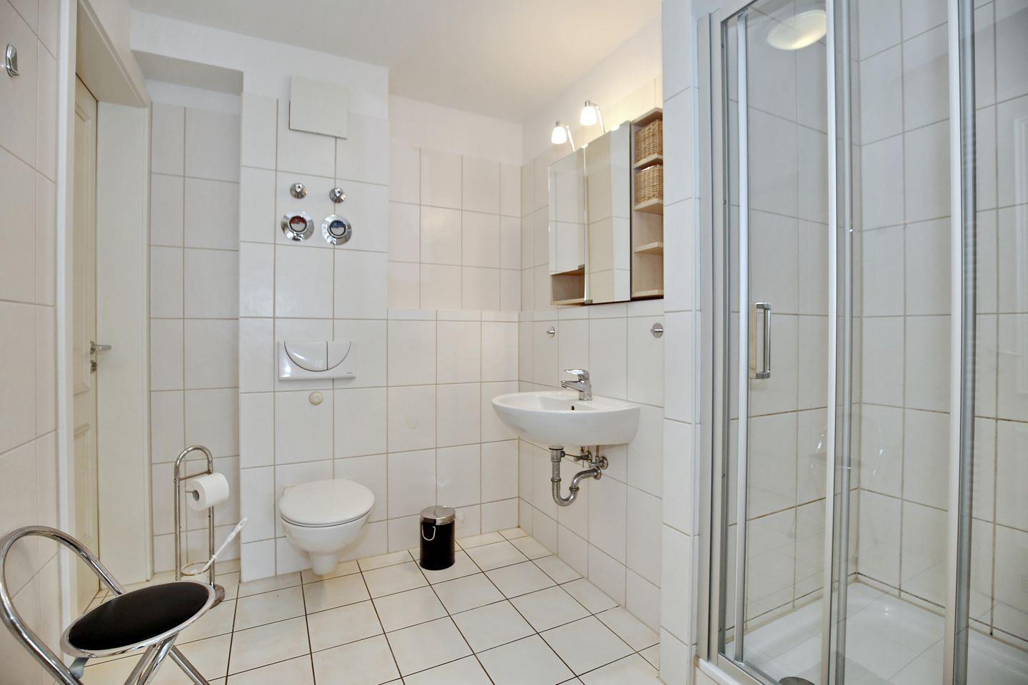 Das moderne Duschbad befindet sich auch im 1. Obergeschoss und verfügt über einen großen Waschtisch, Ablageflächen für deine Waschutensilien und einen beleuchteten Spiegel.