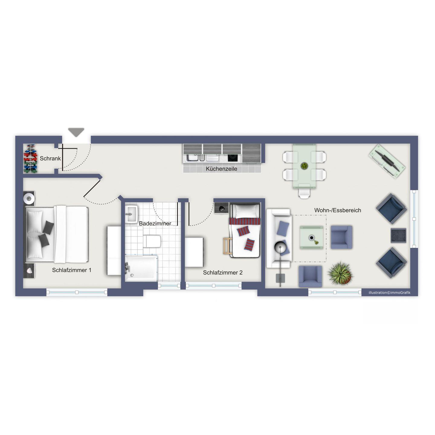 Im 1. Schlafzimmer befindet sich ein Doppelbett (2 x 90 x 200 cm), im 2. Schlafzimmer ein Etagenbett (2 x 90 x 200 cm) und jeweils ein Kleiderschrank für dein Gepäck. In beiden Schlafzimmern dienen Vorhänge zum Verdunkeln.