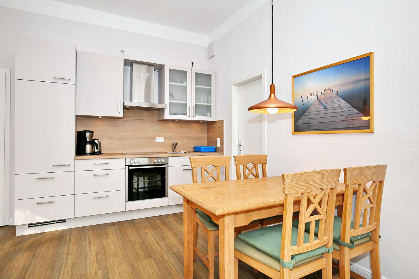 Der Esstisch und die Küchenzeile sind im Wohnraum integriert. Die Küche wartet mit einem Geschirrspüler, Herd mit Backofen, einem 4-Zonen-Cerankochfeld sowie einem Kühlschrank mit Gefrierfach auf. Selbstverständlich stehen Kaffeemaschine, Wasserkocher und Toaster ebenfalls bereit.