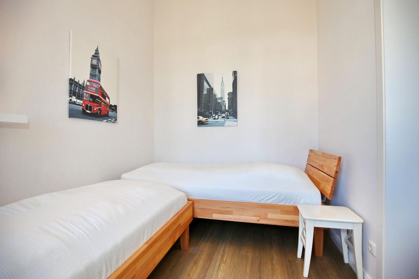 Im ersten Schlafzimmer der Ferienwohnung steht dir ein großes Doppelbett (2 x 90 x 200 cm) zur Verfügung. Das zweite Schlafzimmer ist mit zwei Einzelbetten (90 x 200 cm) ausgestattet. Deine Urlaubsgarderobe und Reiseutensilien bringst du im geräumigen Kleiderschrank unter. An den Fenstern dienen Vorhänge als Verdunklungsmöglichkeit.