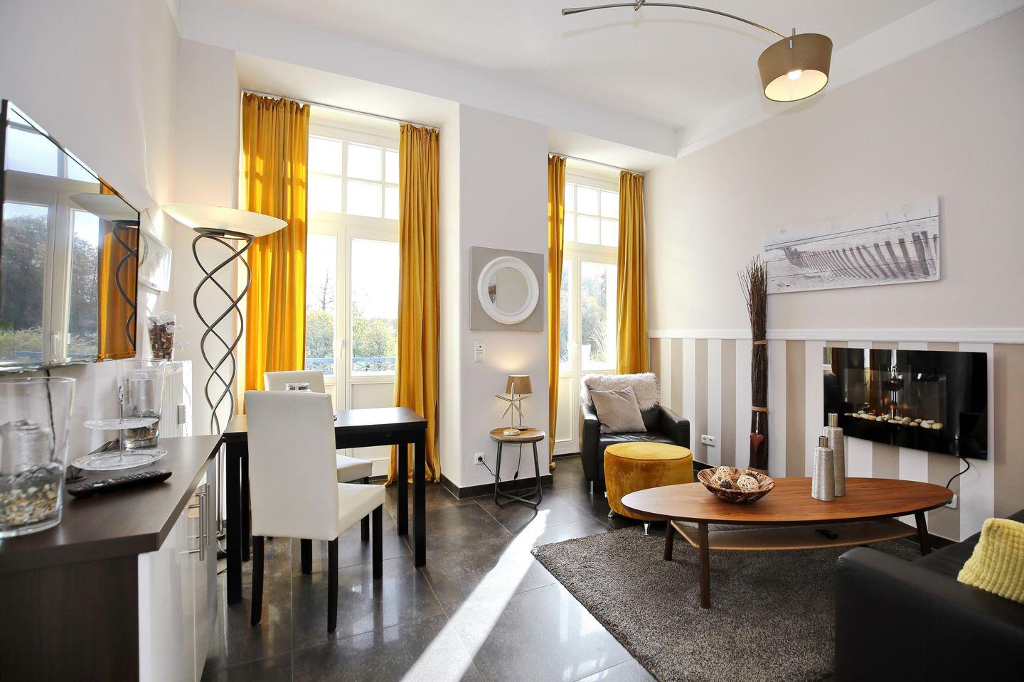 Das Herzstück des Appartements bildet der Wohn-Essbereich mit dem angrenzenden großen Balkon und dem fantastischen seitlichen Meer- und Parkblick. Hier kannst du dein Frühstück mit Sonne und einer Meeresbrise genießen oder vor dem Frühstück schon direkt mit deinem mitgebrachten Bademantel an den Strand gehen.