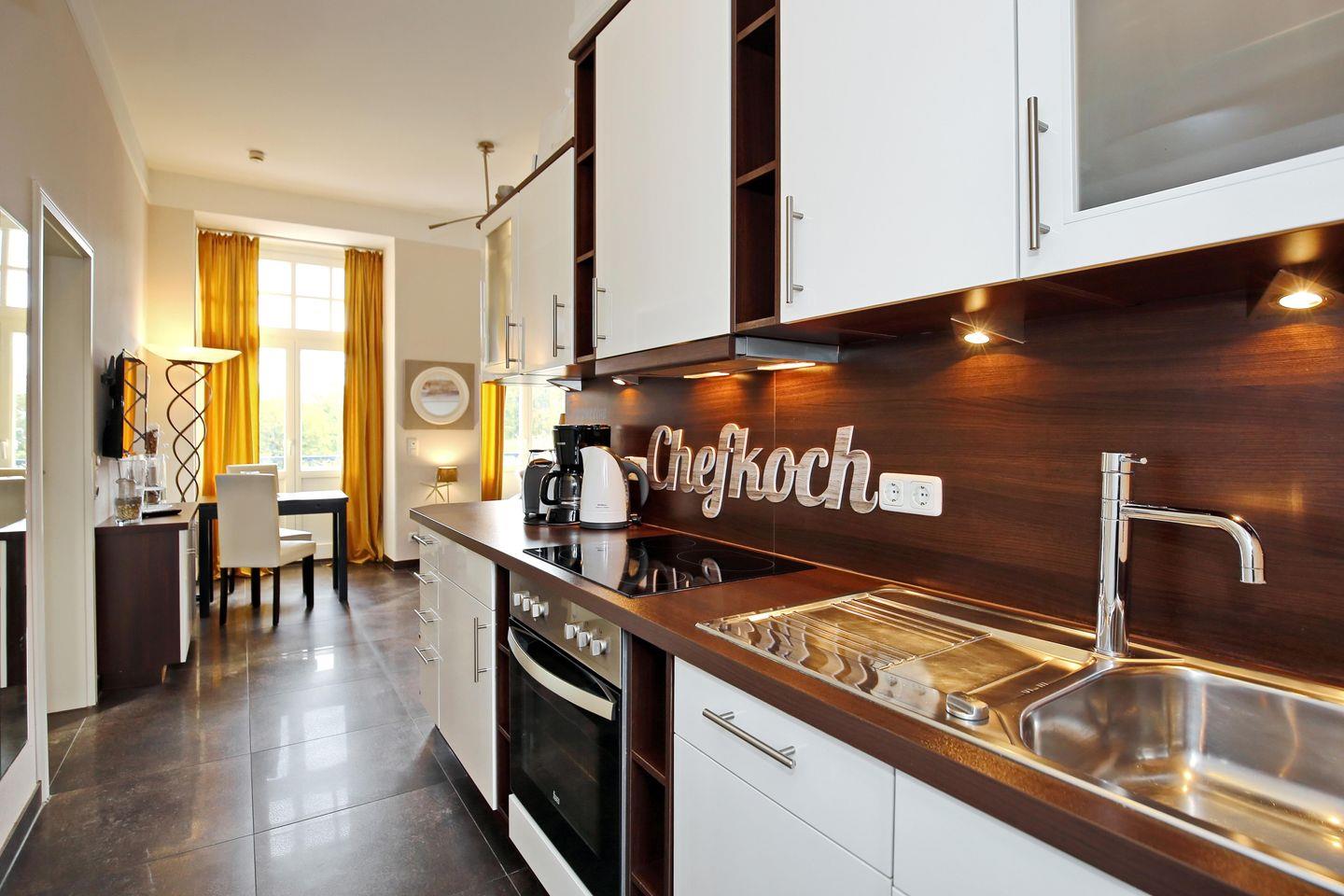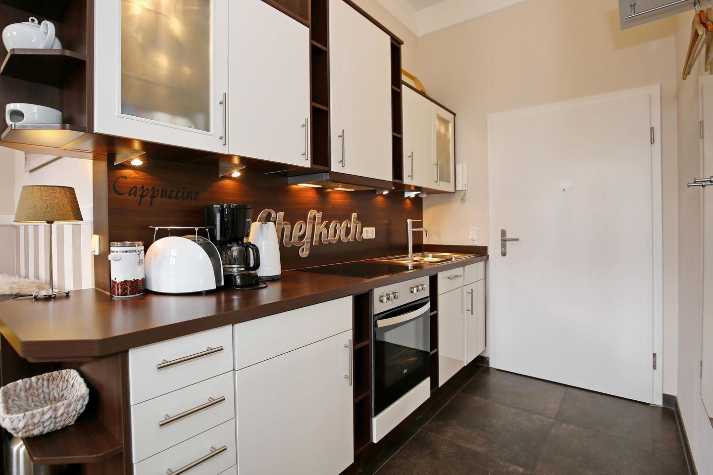 Die gut ausgestattete Küchenzeile lädt zum gemeinsamen Kochen und Genießen ein und verfügt über ein 4er Cerankochfeld, einen Backofen, einen Geschirrspüler, einen Kühlschrank mit Gefrierfach sowie viele Küchenutensilien.