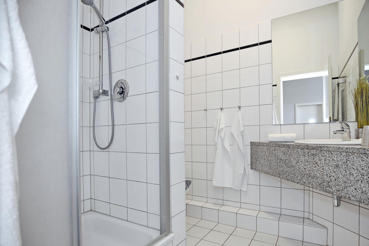 Die Ferienwohnung verfügt selbstverständlich auch über ein Duschbad mit WC und Spiegel. Als Bodenbelag befinden sich im Bad Fliesen und im Schlafzimmer sowie Wohnbereich Vinyl-Boden.