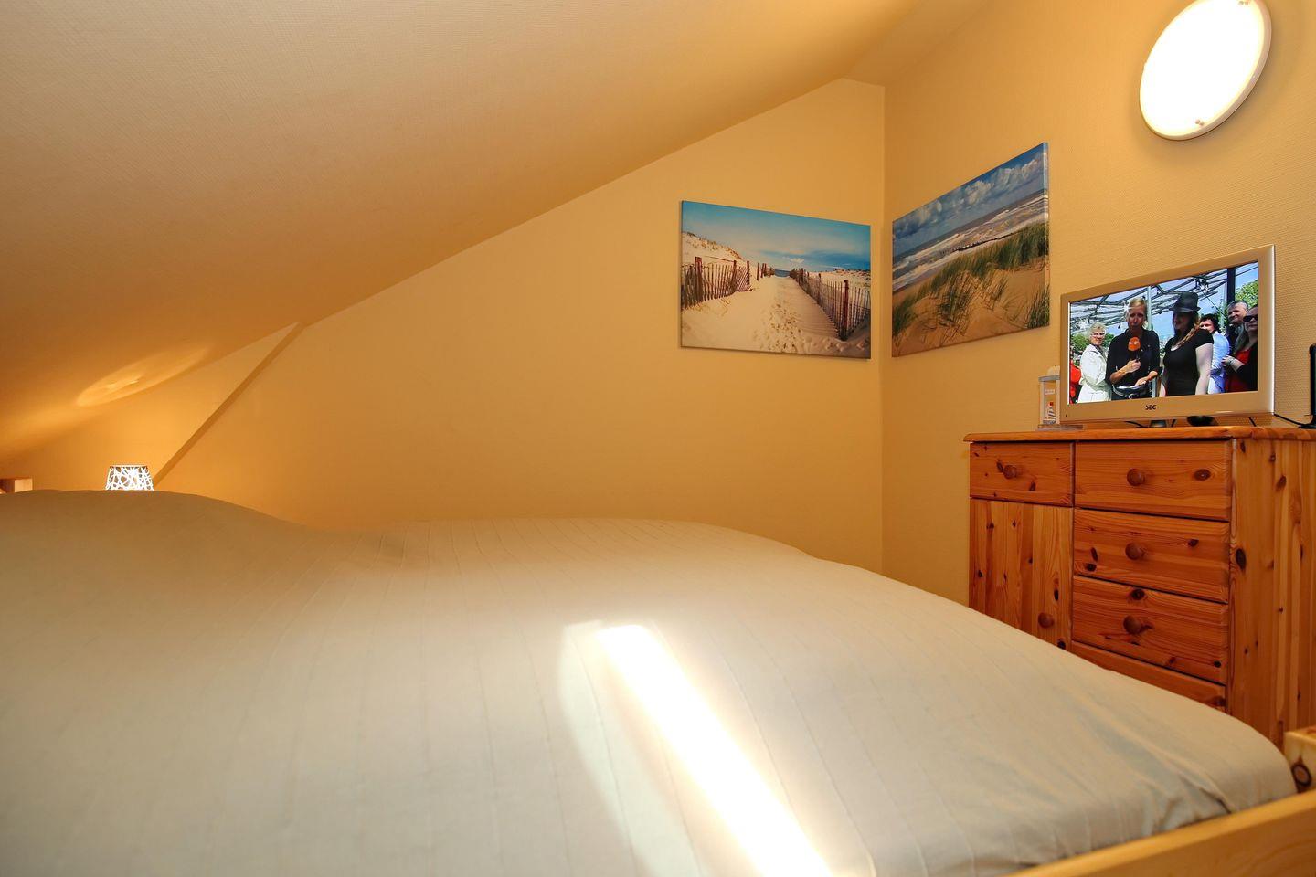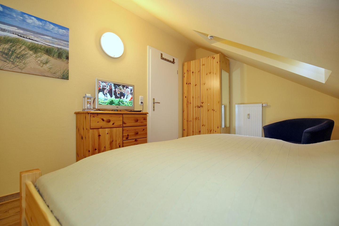 Das Schlafzimmer ist mit einem Doppelbett ( 2 x 90 x 200 cm ), einem Kleiderschrank, einer Kommode und einem 2. Flachbild-TV ausgestattet. Zur Verdunklung dient das Plissee.