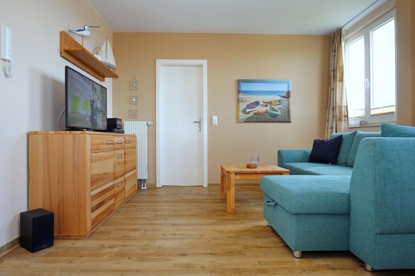 Im Wohnraum steht Ihnen eine bequeme Schlafcouch (140 x 200 cm ), ein Flachbild-TV, ein DVD-Player und ein DAB + Internetradio mit CD-Player zur Verfügung.