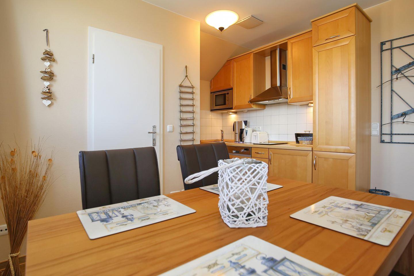 Die Küchenzeile im Wohnraum beinhaltet einen Kühlschrank mit Gefrierfach, 2 Induktionskochfelder, eine Mikrowelle und einen Geschirrspüler sowie Toaster, Wasserkocher und Kaffeemaschine. Ein großzügiger Esstisch bietet Platz für gemeinsame Mahlzeiten.