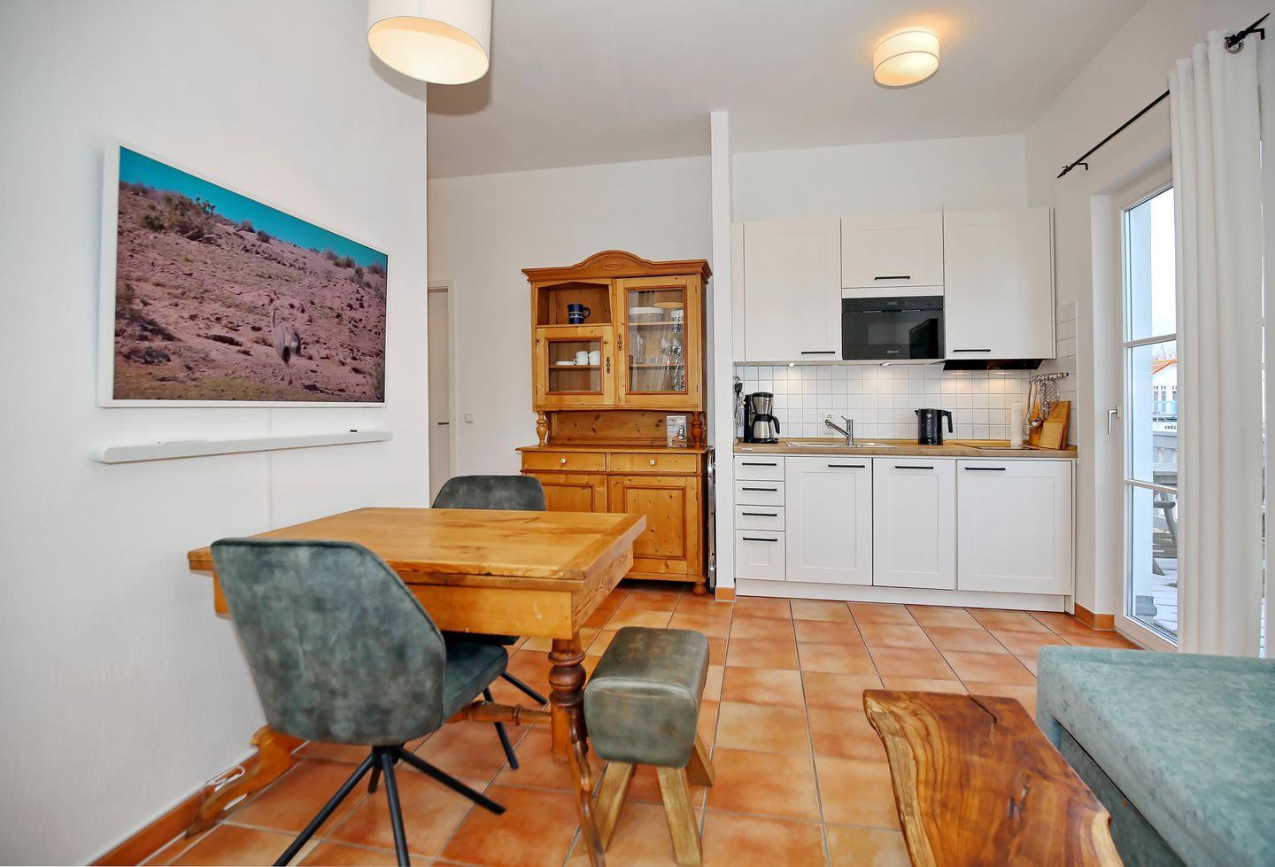 Der angrenzende Esstisch bietet für 3 Personen genügend Platz für gemeinsame Mahlzeiten, die du in der modernen Küchenzeile zubereiten kannst. Neben einem 2-Platten-Induktionsherd, einer Mikrowelle mit Crisp-Funktion, einem Kühlschrank, einem Geschirrspüler und einer Kaffeemaschine wurde auch an einen Toaster sowie an einen Wasserkocher für die perfekte Ausstattung der Küche gedacht.