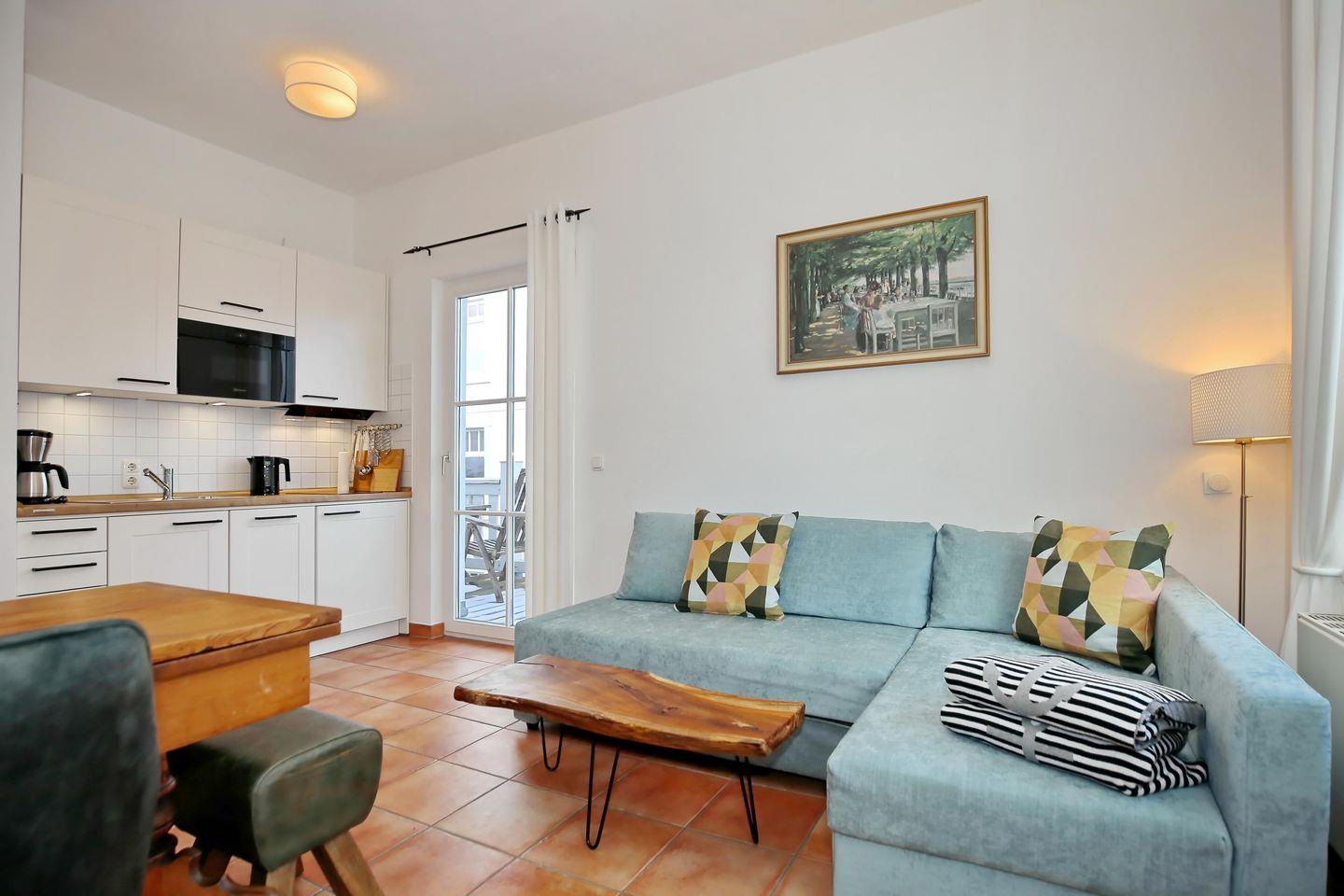 Im Wohnbereich kannst du es dir auf dem Schlafsofa (140 x 200 cm) und im Lesesessel bequem machen. Ein 50-Zoll-Smart-TV und eine Soundbar sorgen für beste Unterhaltung. WLAN/Internet steht dir kostenfrei zur Verfügung. Vom Wohnbereich gelangst du zum großzügigen möblierten Balkon.