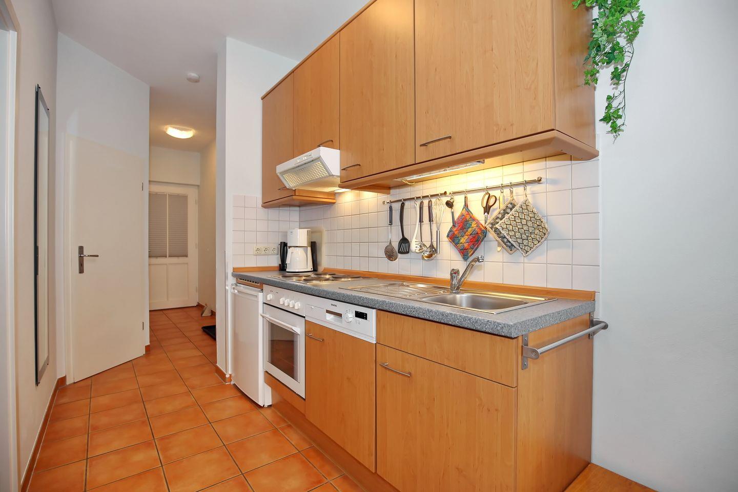 Die zum Wohnbereich angrenzende Küchenzeile ist für dich mit einem Kühlschrank mit Gefrierfach, einem Geschirrspüler, einem Toaster, einem Wasserkocher sowie einer Kaffeemaschine gut ausgestattet. Zum Kochen und Backen ist für dich ein 4-Platten-Herd mit Backofen vorhanden.