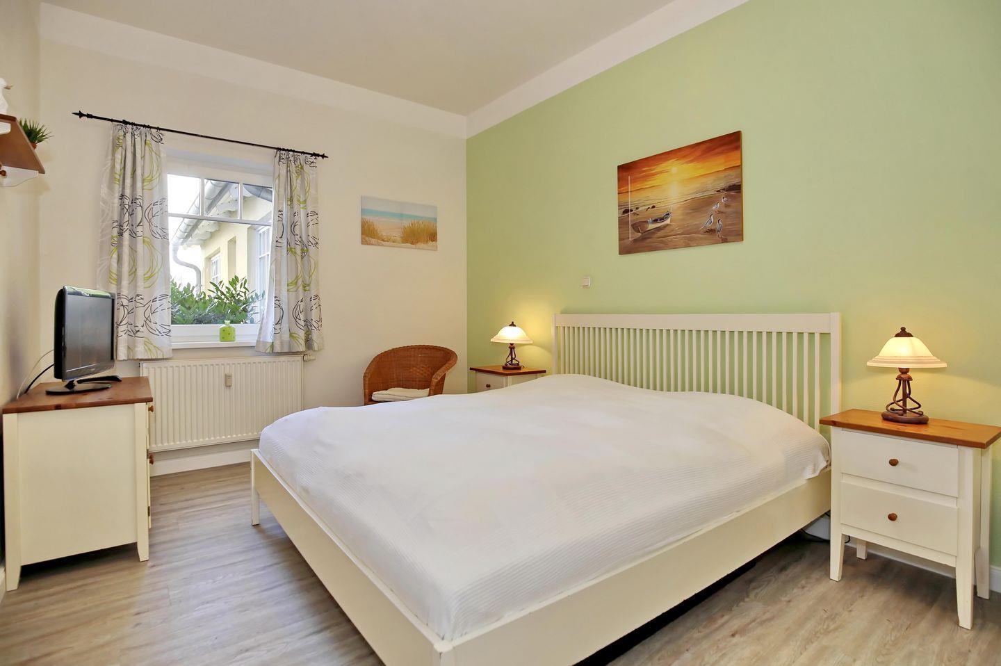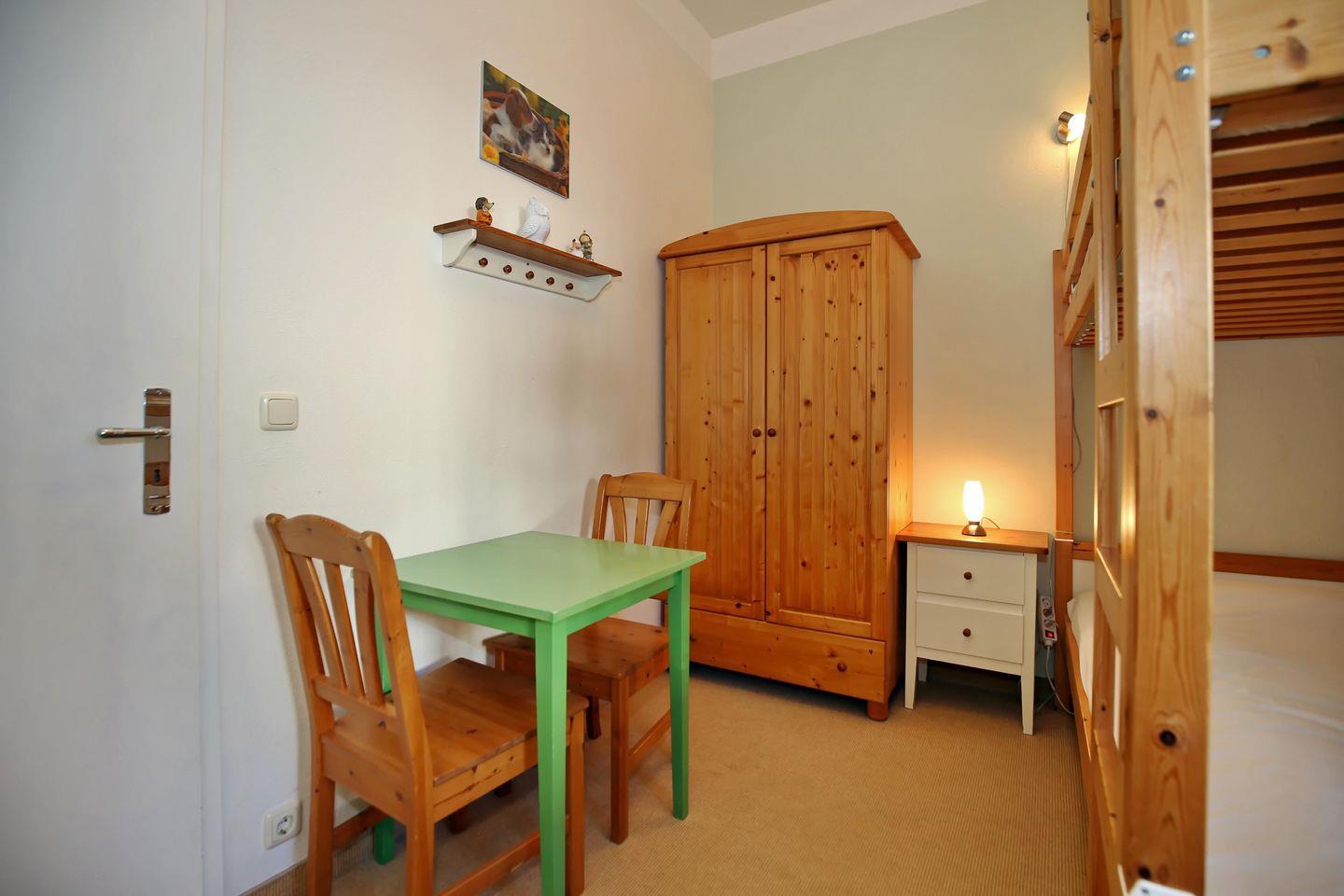 Erholsame Nächte in der Ferienwohnung findest du in einem der beiden Schlafzimmer. Das erste Schlafzimmer hat ein großes Doppelbett (2 x 90 cm x 200 cm) zu bieten. Deine Urlaubsgarderobe kann im Kleiderschrank und der Kommode untergebracht werden. Ein zweiter Fernseher sorgt hier für Unterhaltung. Im zweiten Schlafzimmer findest du ein Etagenbett (90 cm x 200 cm) und einen Kleiderschrank vor. An den Fenstern hängen Vorhänge zur Abdunkelung.
