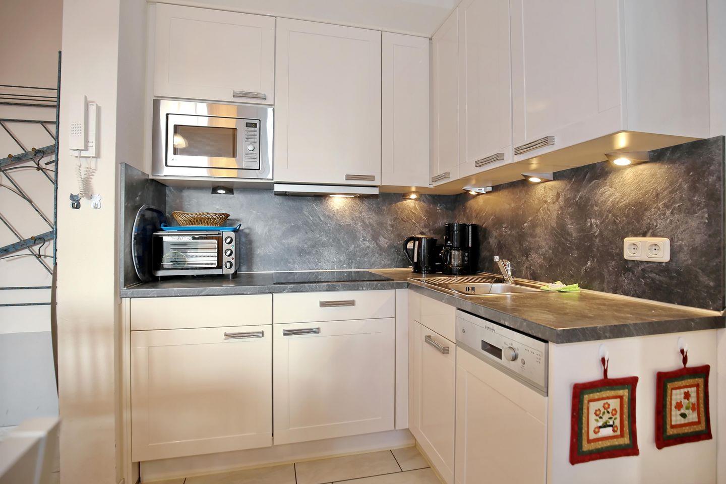 Eine komplett eingerichtete Küchenzeile bietet unter anderem einen 4-Platten-Cerankochfeld, einen Minibackofen, einen Geschirrspüler, eine Mikrowelle mit Grillfunktion, einen Kühlschrank mit Gefrierfach, eine Kaffeemaschine, einen Toaster und einen Wasserkocher. Am angrenzenden Esstisch haben 4 Personen Platz.