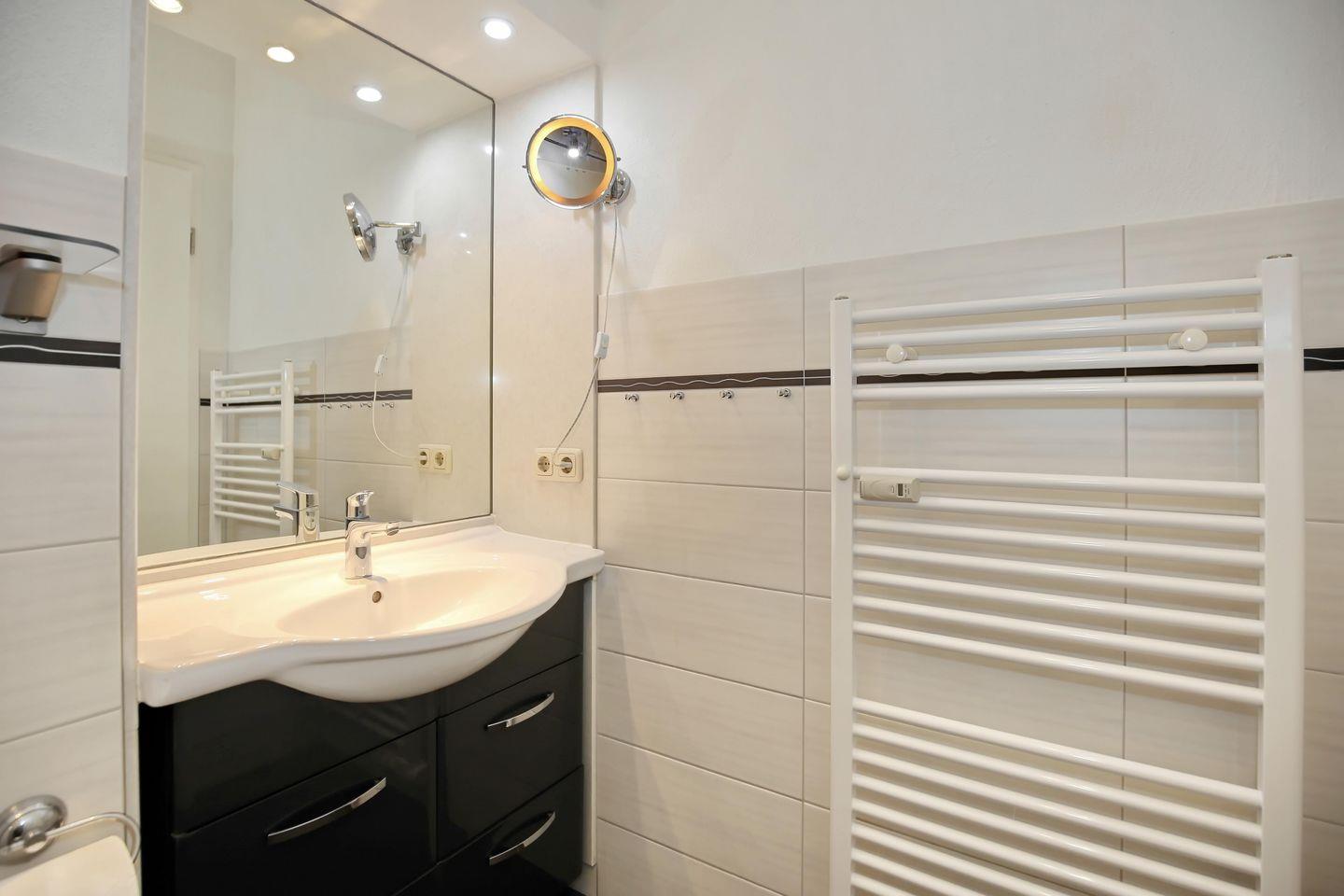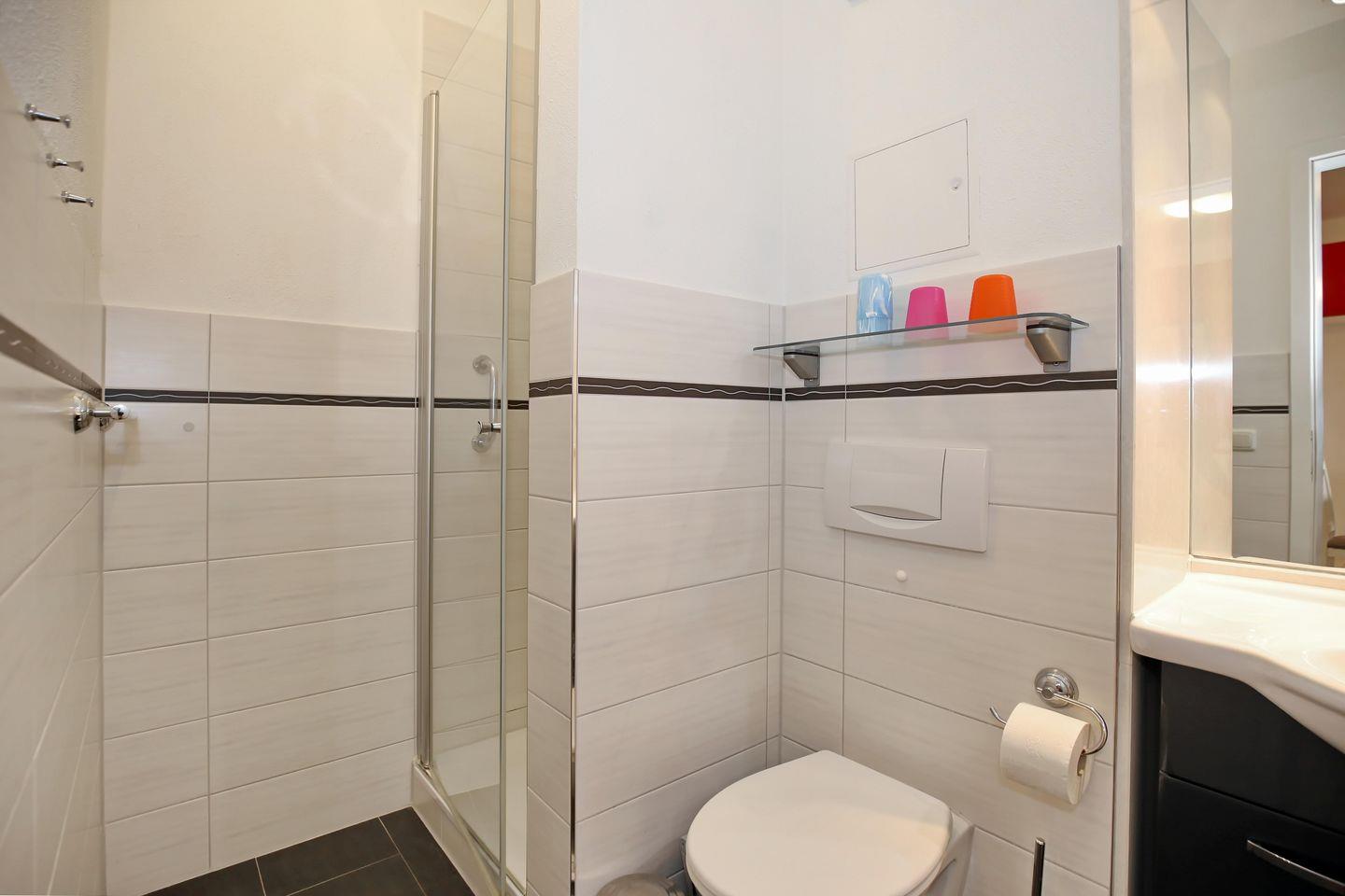 Selbstverständlich verfügt die Ferienwohnung über ein Badezimmer. Hier erwarten dich eine Dusche, ein WC, ein Waschbecken und ein großer Spiegel. Als Bodenbelag wurden Fliesen verwendet. Nur in den Schlafzimmern gibt es einen Teppichboden.