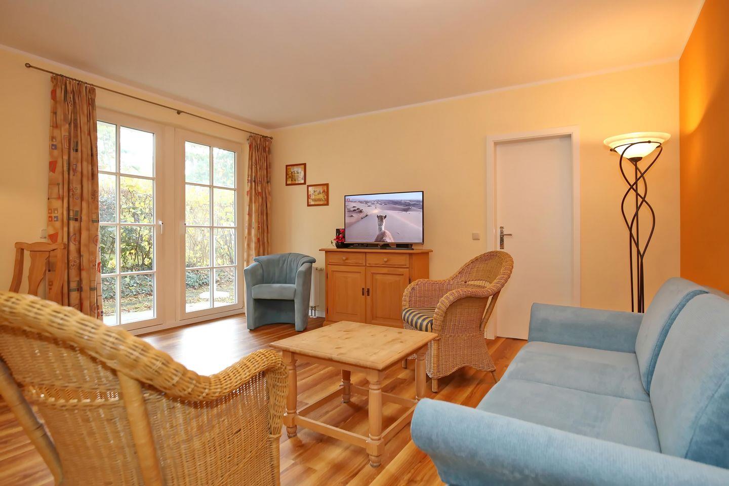 Der Wohnbereich der Ferienwohnung besticht durch seine freundlichen Farben, einer Couch mit Schlaffunktion (180 x 200 cm) – diese bietet Platz für eine Aufbettung für 2 Personen, zwei Korbsesseln sowie einen Couchtisch und einen Flachbild-TV. Der Essbereich bietet dir für 4 Personen genügend Platz für gemeinsame Mahlzeiten.