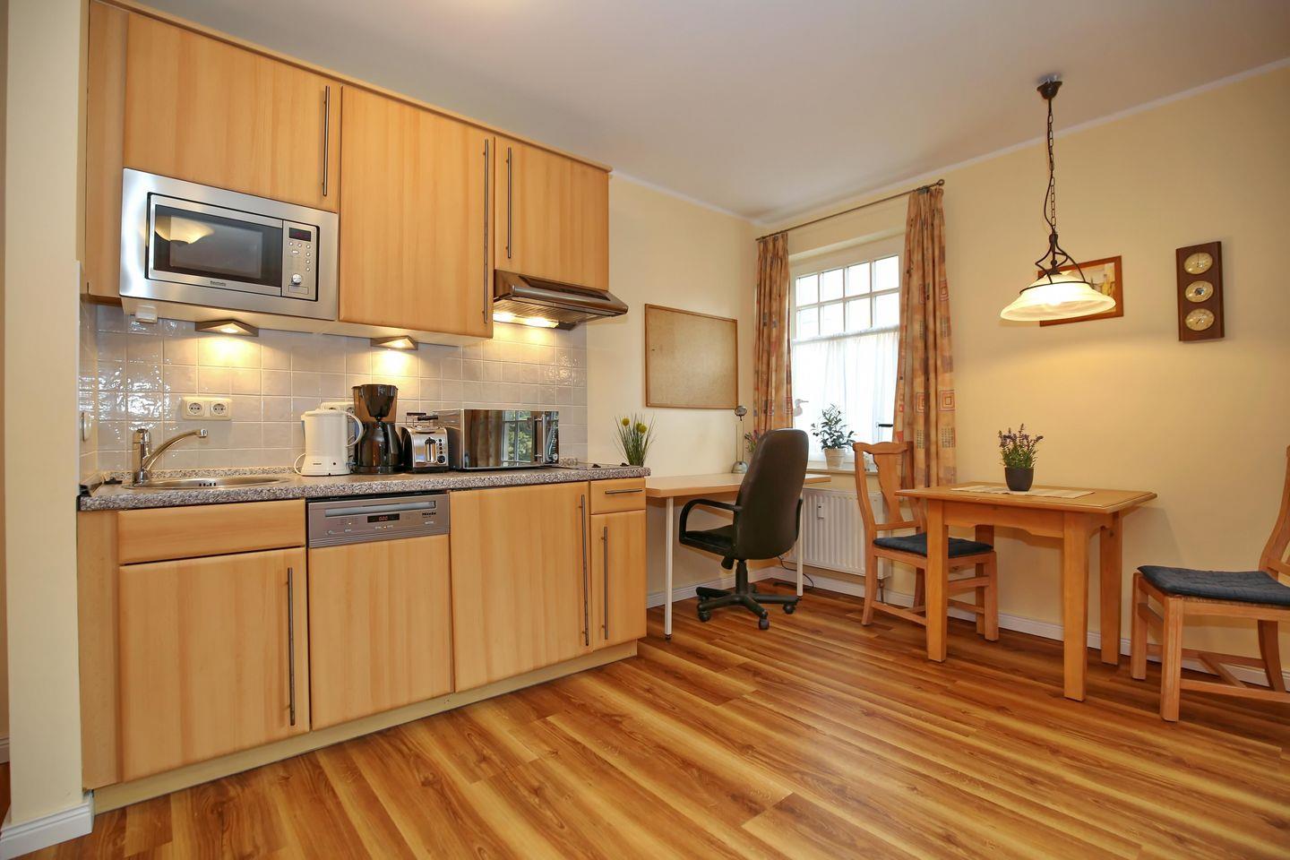 Die Küchenzeile ist für dich gut ausgestattet. Zur Kücheneinrichtung gehören ein Kühlschrank mit Gefrierfach, ein 2-Platten-Kochfeld, Grill/Heißluft-Mikrowelle, Geschirrspüler sowie Wasserkocher, Toaster und Kaffeemaschine.