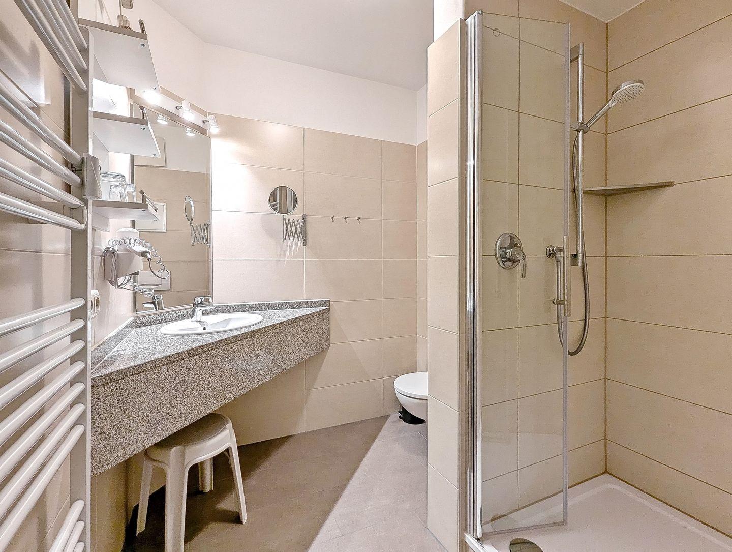 Das Duschbad verfügt über einen Waschtisch mit viel Ablagefläche für deine Waschutensilien, einen Föhn und einen beleuchteten Spiegel. Die Wohnung ist komplett mit Design-Belag ausgelegt.