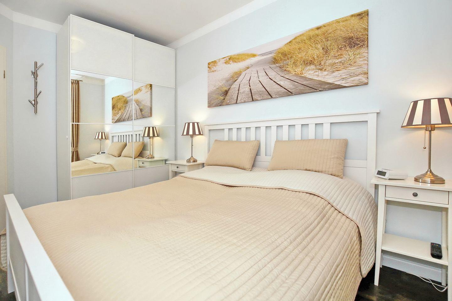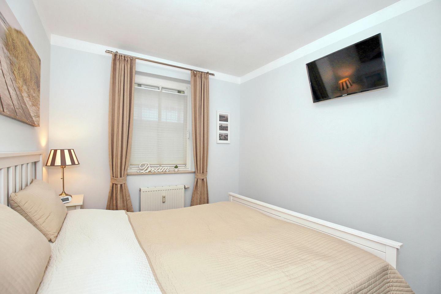 Im Schlafzimmer dieser Ferienwohnung lädt ein Doppelbett (2 x 90 x 200 cm) zum erholsamen Schlaf ein. Ebenso befindet sich hier ein 2. Flachbild-TV. Ein großer Kleiderschrank bietet viel Stauraum (das Schlafzimmerfenster geht zum Atrium raus).