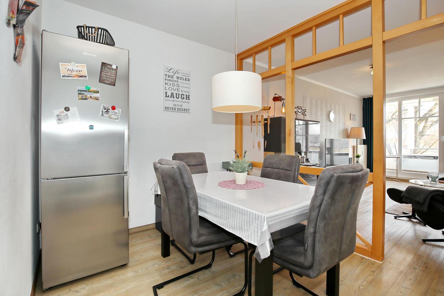 Die angrenzende Küchenzeile mit Essbereich ist mit einer großen separat stehenden Kühl-/Gefrierkombination, einem Geschirrspüler und einem Backofen mit einem Cerankochfeld voll ausgestattet. Natürlich stehen dir ein Toaster, eine Kaffeemaschine und ein Wasserkocher zur Verfügung.