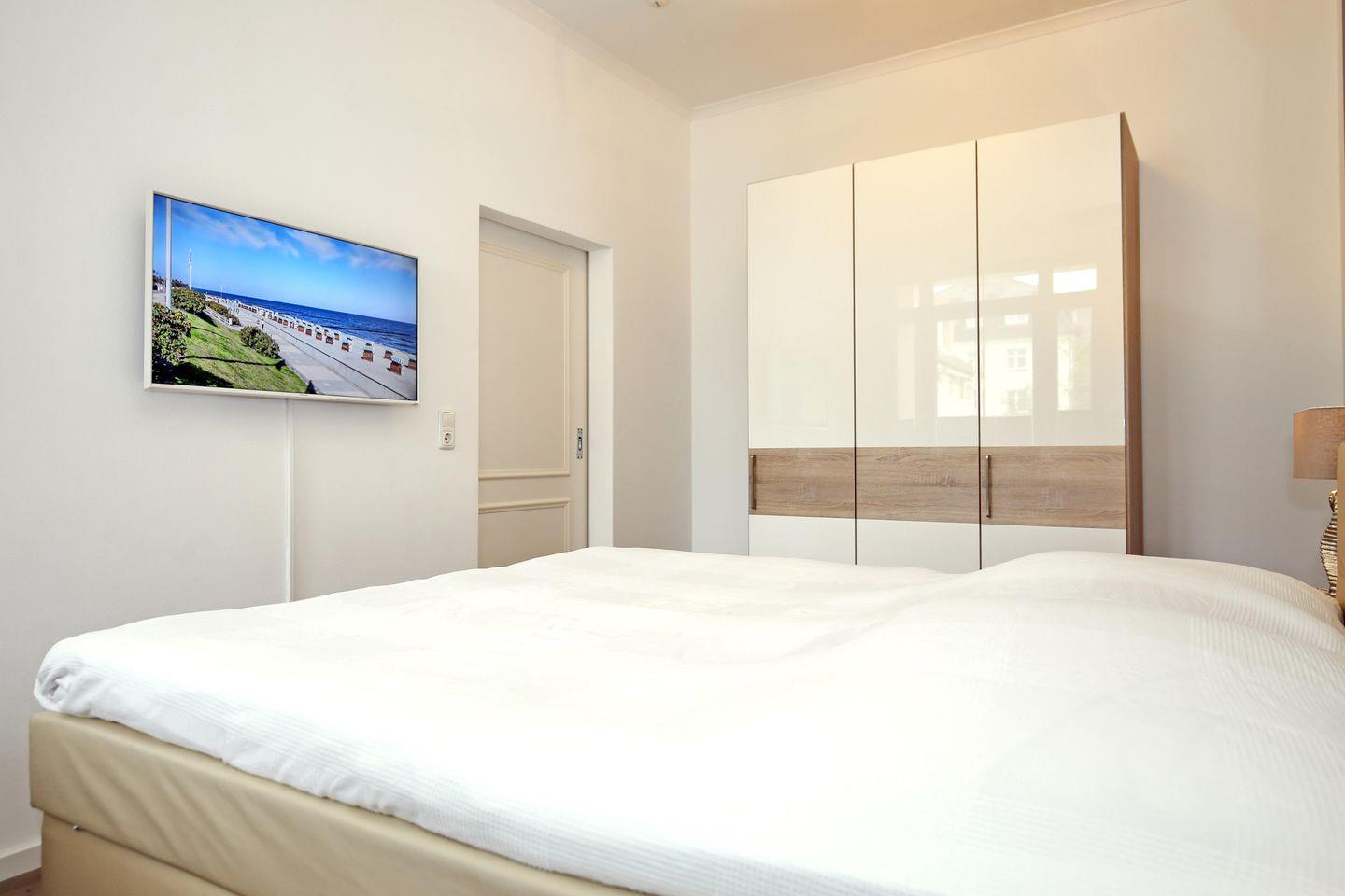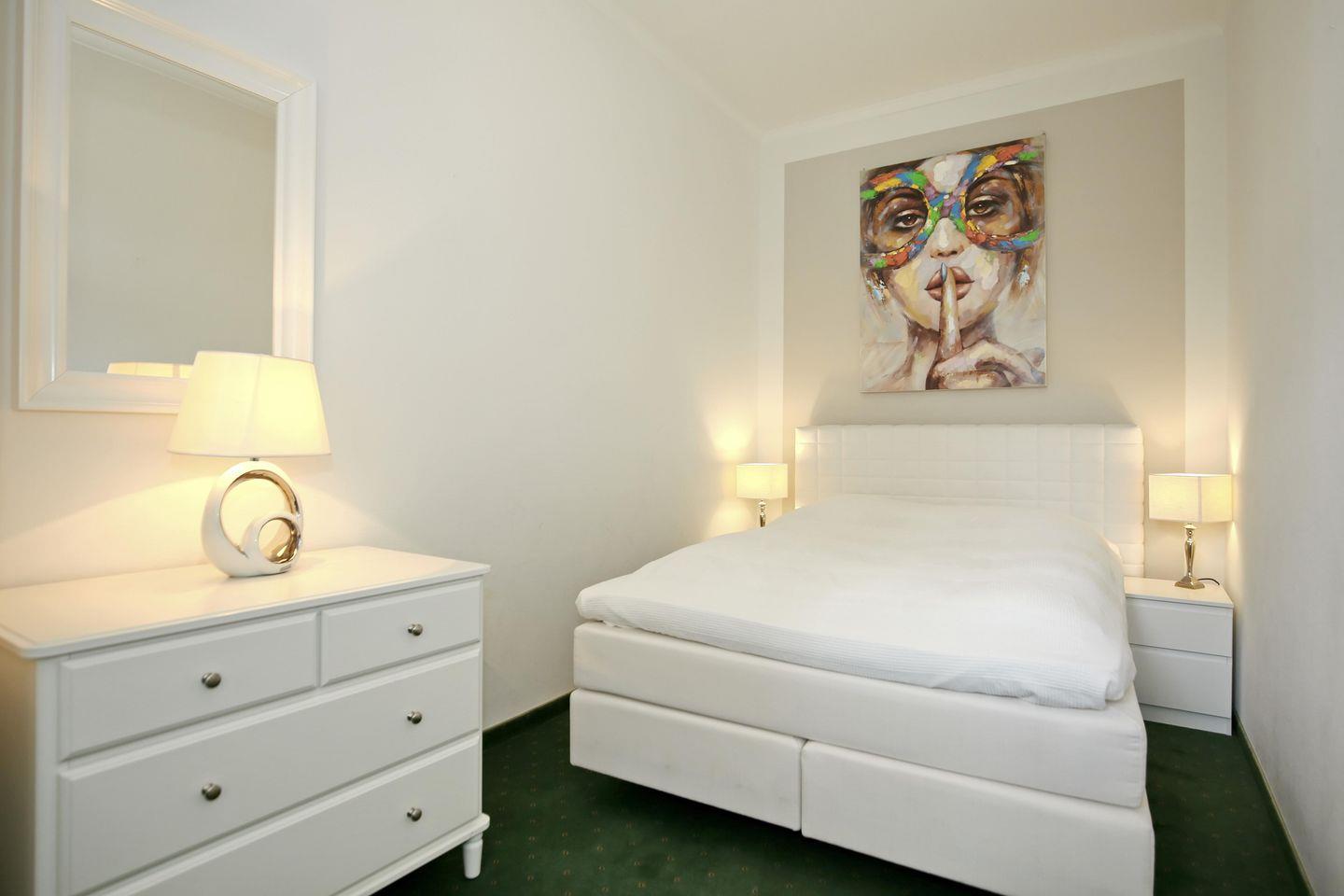Im Schlafzimmer der Ferienwohnung erwartet dich ein Boxspringbett mit einem Topper (180 x 200 cm) zur erholsamen Nachtruhe. Ein Flachbild-TV sorgt für deine abendliche Unterhaltung. Ein großer Kleiderschrank mit Spiegeltür bietet dir Stauraum für dein Urlaubsgepäck. Der Fußboden wurde mit einem Designbelag ausgestattet. Das zweite Schlafzimmer empfängt dich ebenfalls mit einem Boxspringbett (140 x 200 cm) für 2 Personen. Der Fußboden wurde mit Teppich ausgestattet. Auch steht dir ein Kleiderschrank zur Verfügung. Die Schlafcouch (120 x 200 cm) im Wohnbereich wird mit wenigen Handgriffen zu einem bequemen Schlafplatz. Für unsere kleinen Gäste ist in der Wohnung ein Kinderreisebett (ohne Matratze) vorhanden. Vorhänge dienen dir in den Schlafräumen als Sichtschutz bzw. zum Verdunkeln.