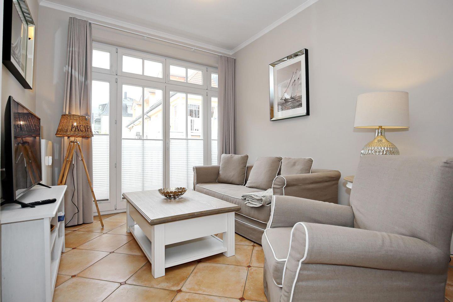 Gemütliche 3-Zimmer-Wohnung im Dünenschloss Kühlungsborn, nur 50 m vom Strand entfernt, mit Sauna, Schwimmbad und Balkon.