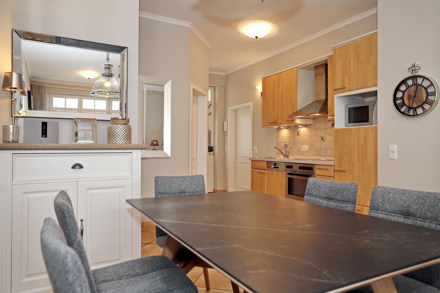Die angrenzende Küchenzeile ist für dich mit einem Herd mit Backofen und einem 4-Platten-Cerankochfeld, einem Kühlschrank mit Gefrierfach, einem Geschirrspüler und einer Mikrowelle voll ausgestattet. Nützliche Kleingeräte, wie eine Kaffeemaschine, ein Toaster und ein Wasserkocher komplettieren die Kücheneinrichtung.