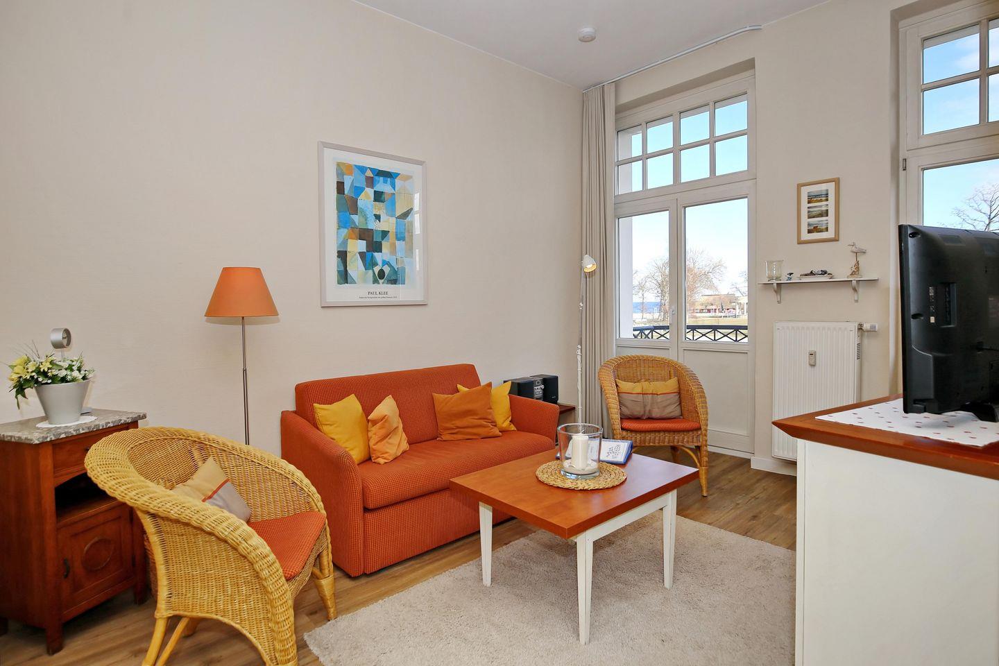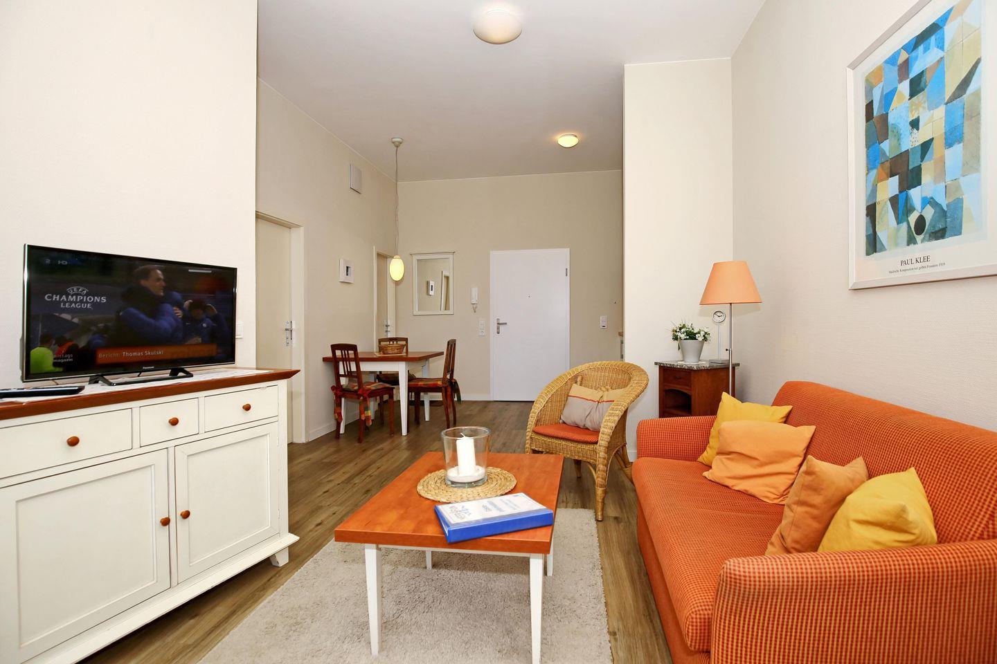 Im Wohnbereich kann das bequeme Sofa mit wenigen Handgriffen in einen Schlafplatz für 1 Person (120 x 200 cm) umgewandelt werden. Weiterhin gehören ein Flachbild-TV und ein DVD-Player zur Ausstattung.