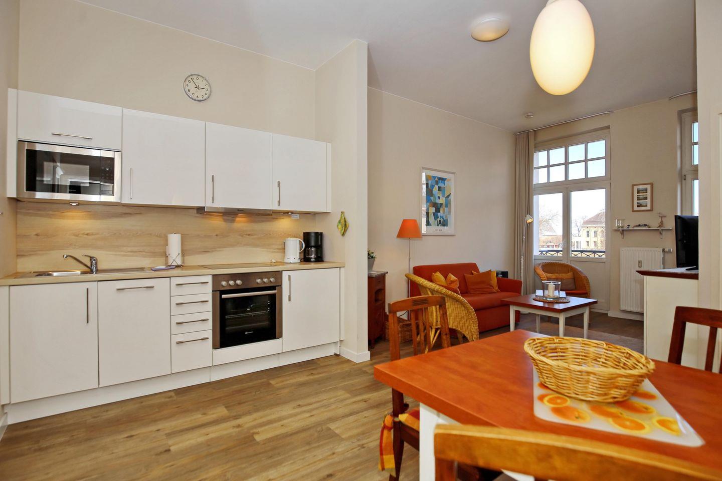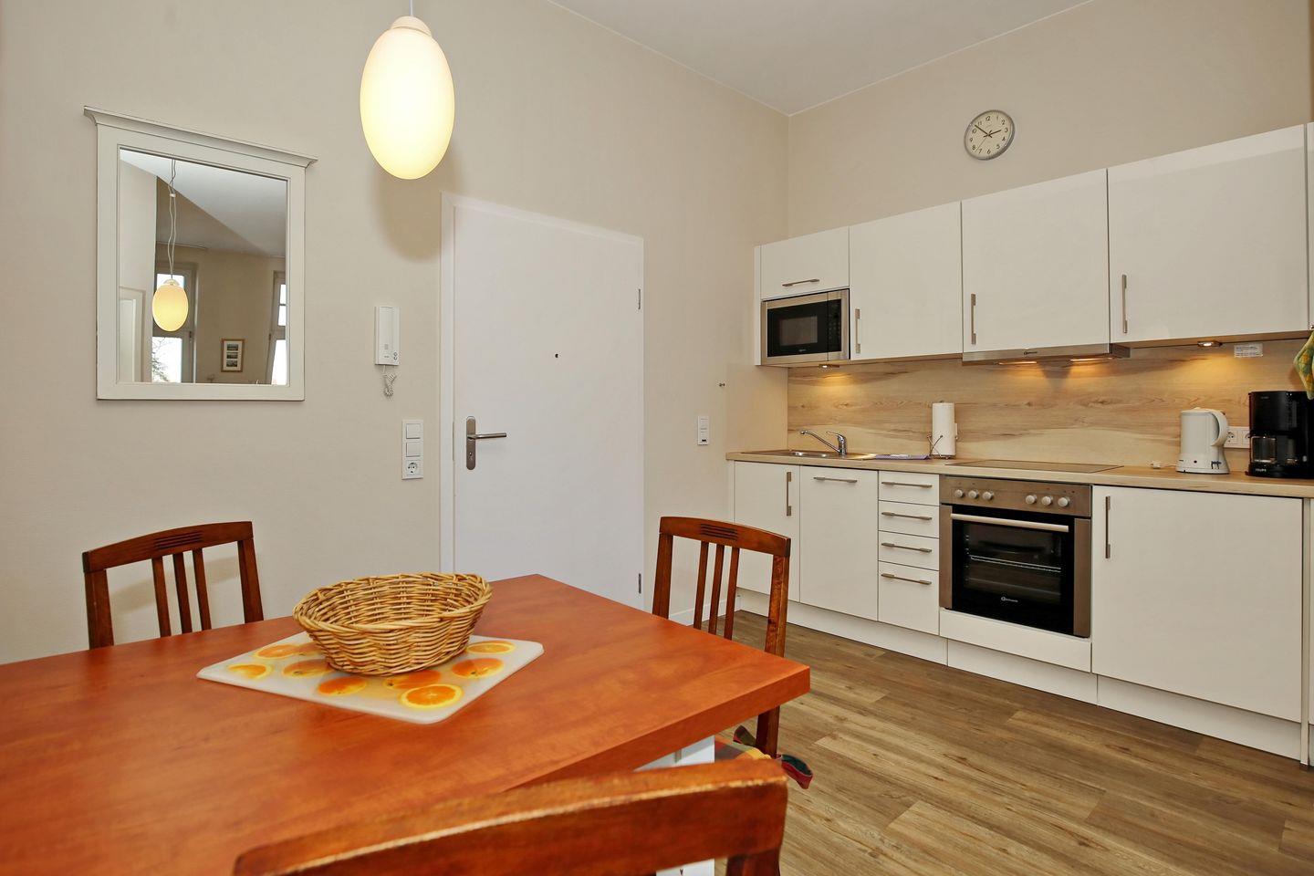 Die Küchenzeile im Wohnraum umfasst 4-Ceran-Kochfelder, Backofen, Mikrowelle, Geschirrspüler, Kühlschrank mit Gefrierfach, Toaster, Wasserkocher und Kaffeemaschine.