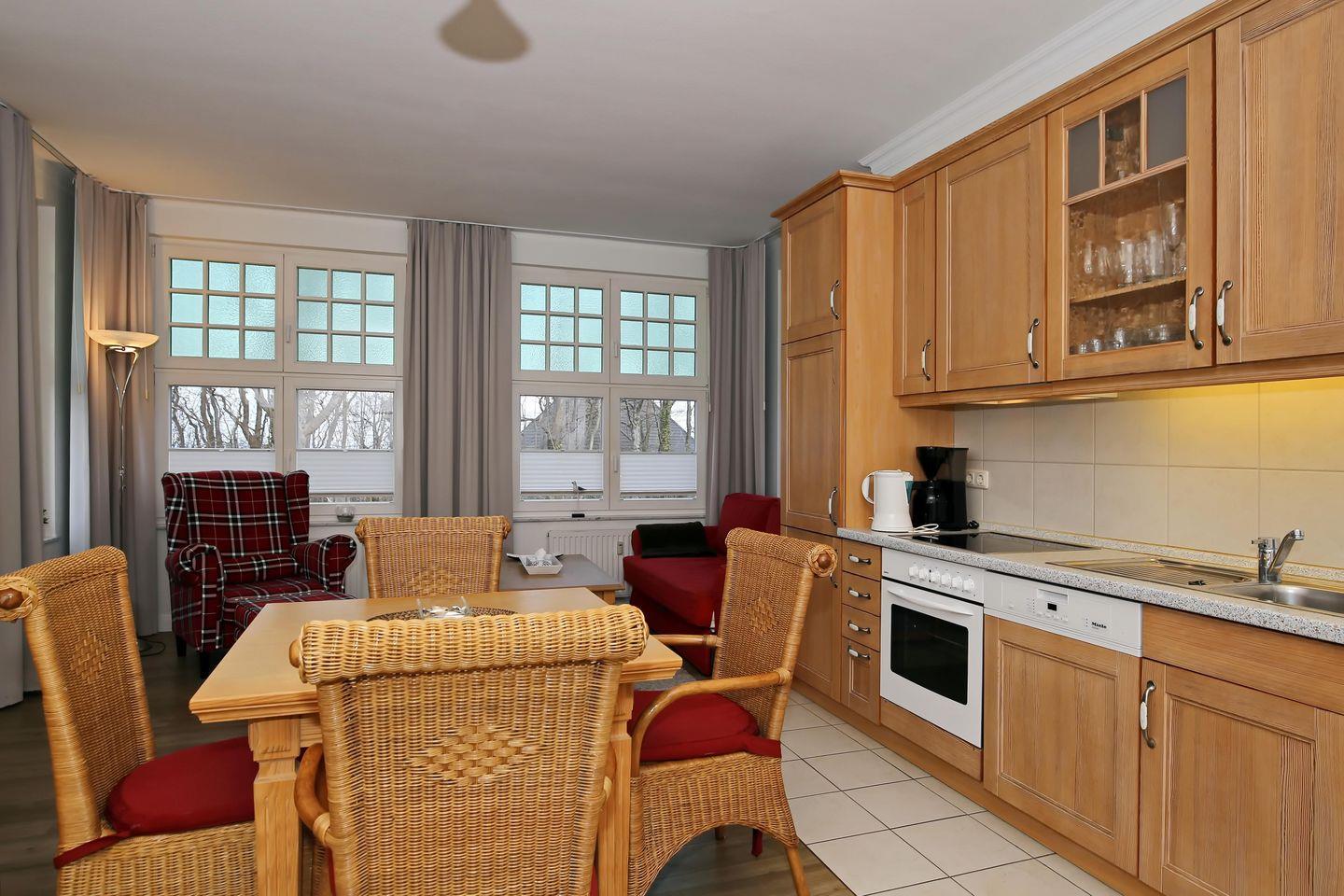 Die im Wohnzimmer integrierte Küchenzeile beinhaltet ein 4-Zonen-Cerankochfeld mit Backofen, einen Geschirrspüler und eine Senseo-Kaffeepadmaschine. Filterkaffeemaschine, Wasserkocher und Toaster stehen dir ebenfalls zur Verfügung.