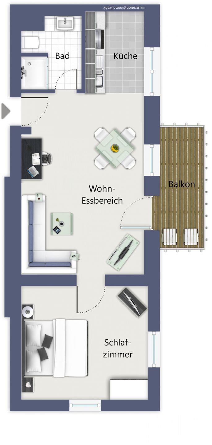 Das Wohnzimmer ist mit einer gemütlichen Eck-Schlafcouch (150 x 200 cm), einem Schreibtisch und einem Flachbild-TV ausgestattet. Im angrenzenden Essbereich hast du ausreichend Platz für gemeinsame Mahlzeiten. Im Wohnbereich befindet sich der Zugang zum Südbalkon.