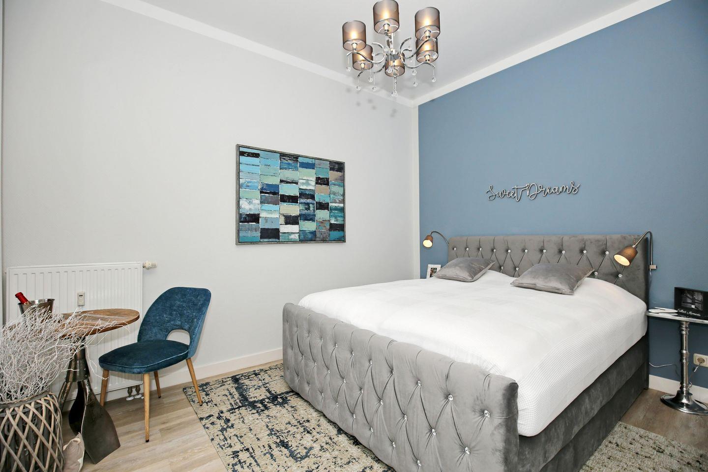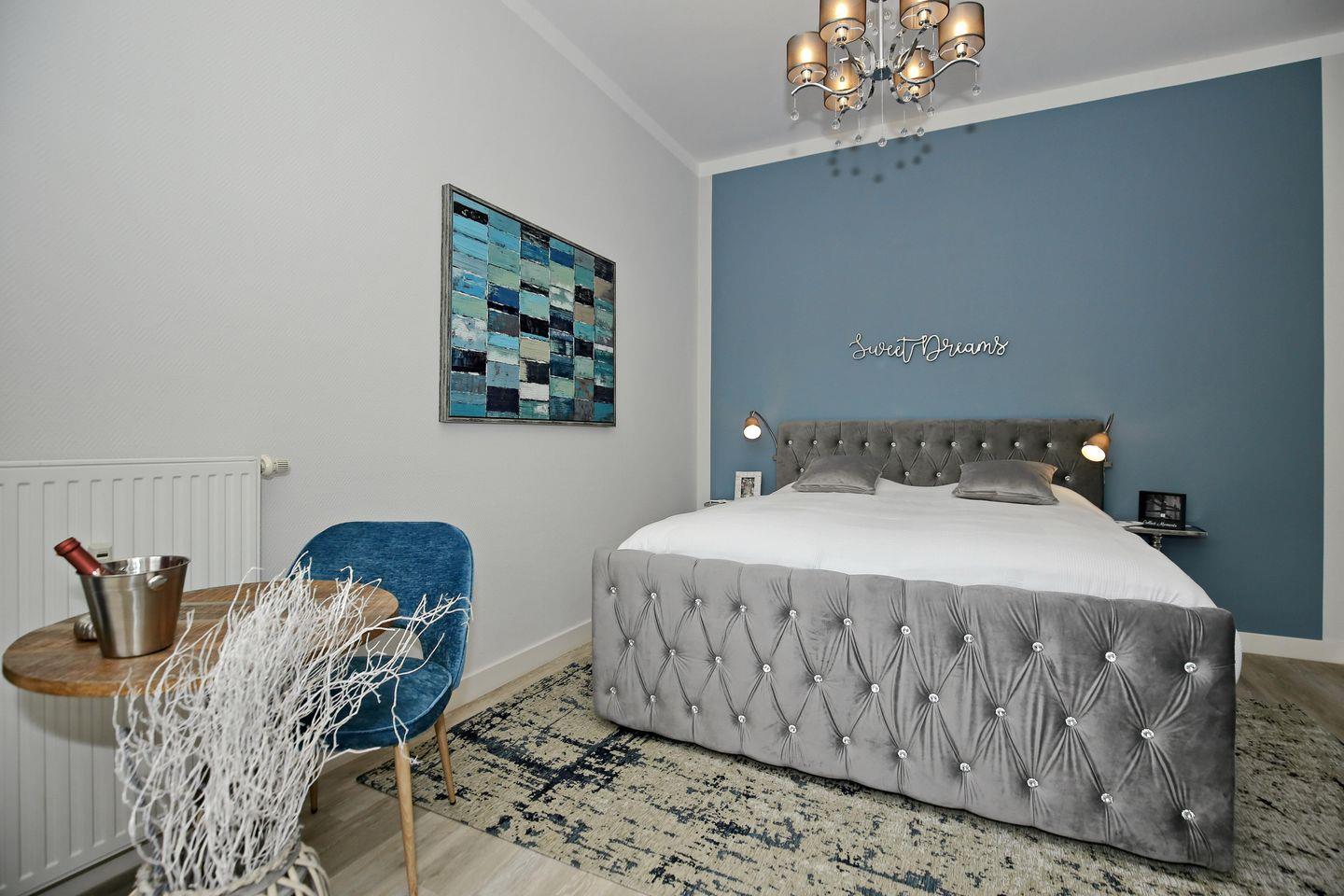 Im Schlafzimmer dieser Ferienwohnung lädt ein exklusives Boxspringbett (180 x 200 cm) mit direktem Ostseeblick zum Träumen ein. Ein großer Kleiderschrank bietet viel Stauraum. Ebenfalls ist hier ein Flachbild-TV und ein kleines Office integriert.