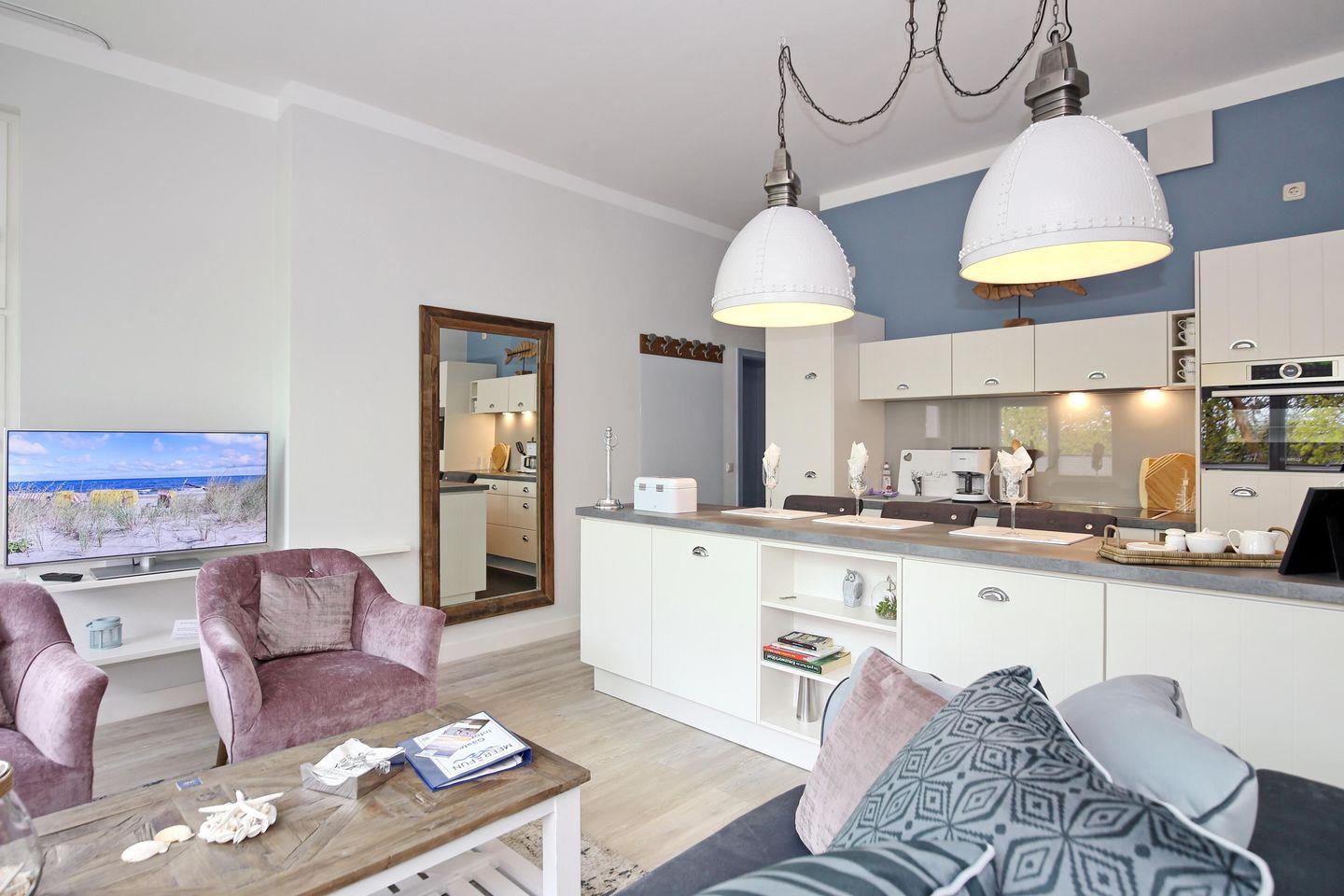 Im großzügig offen gestalteten Wohnraum der Ferienwohnung laden ein Sofa mit Schlaffunktion (140 x 200 cm) und 2 Loungesessel zum Genießen ein, mit umlaufendem Blick auf die Ostsee. Ein moderner Flachbild-TV sorgt gegebenenfalls für eine nötige Untermalung. Durch das Sofa mit Schlaffunktion ist eine Aufbettung bis auf max. 4 Personen möglich. Ebenso kannst du das kostenlose WLAN nutzen.