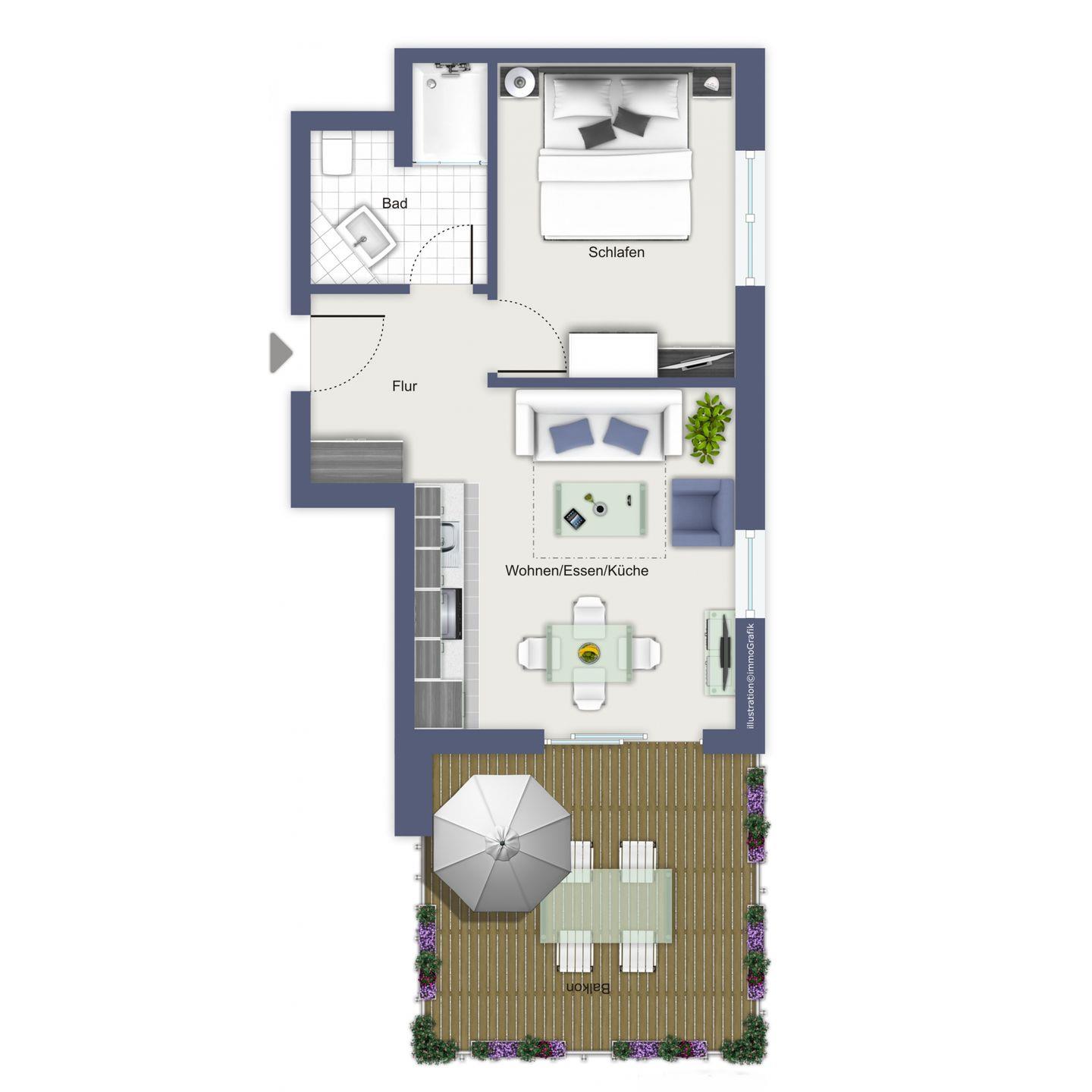 Du betrittst den großen möblierten Balkon der Ferienwohnung vom Wohnzimmer aus. Der Wohnraum ist mit einer gemütlichen und modernen Schlafcouch (120 x 200 cm) und einem Sessel eingerichtet. Für Unterhaltung sorgen ein Flachbild-TV, ein Radio und ein DVD-Player. Ebenso kannst du das kostenlose WLAN nutzen.