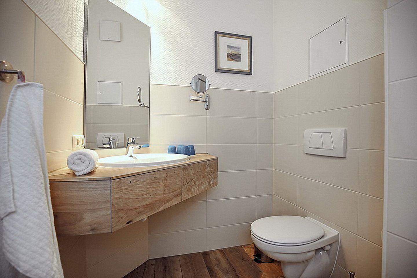 Das moderne Duschbad der Ferienwohnung hat eine Glasdusche, WC, einen Kosmetikspiegel und einen Föhn. Die komplette Wohnung wurde mit hochwertigem PVC-Belag ausgelegt.
