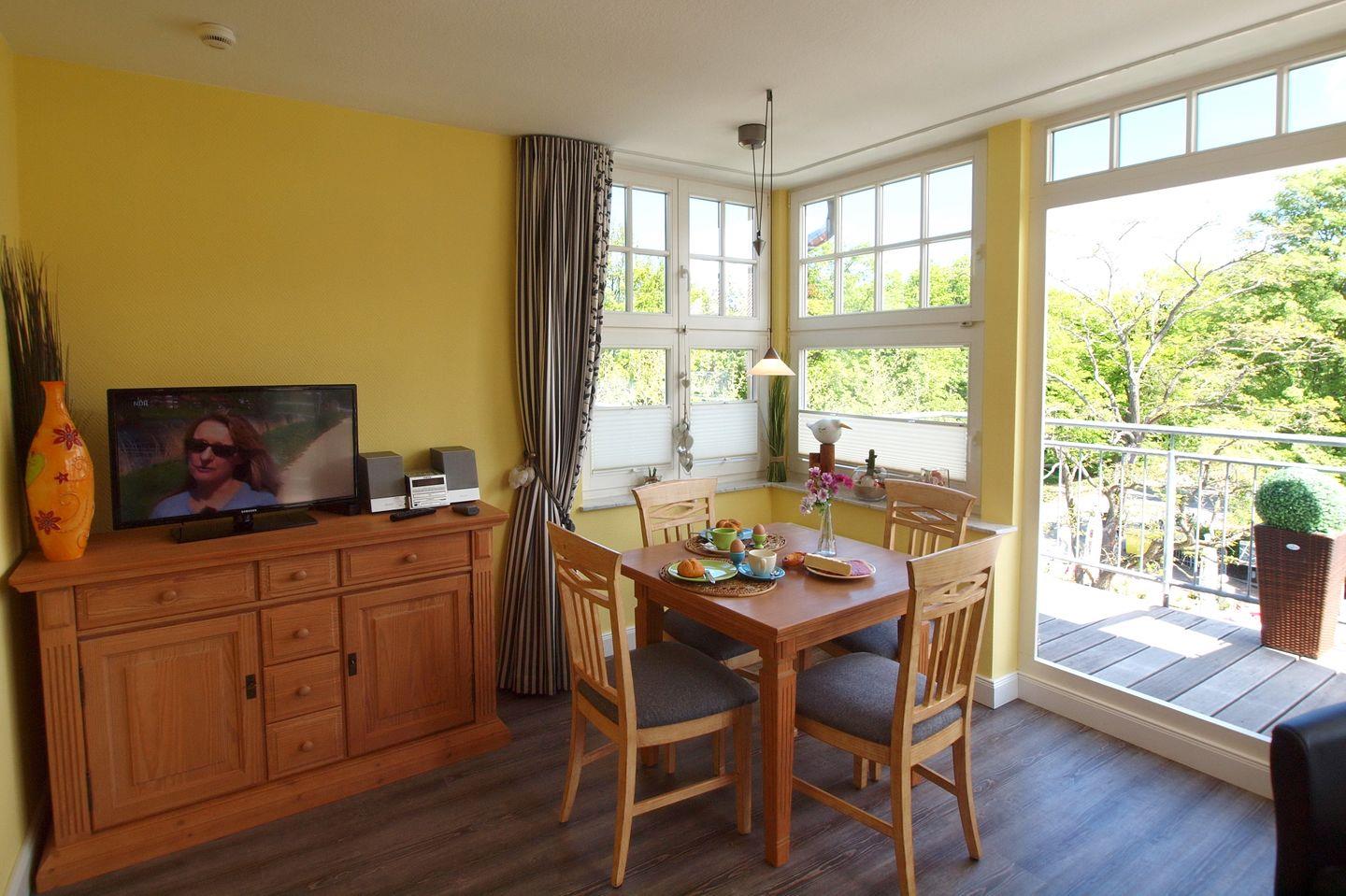 Deine Wohnung Nr. 12 im Haus La Mer ist ein helles 2-Zimmer-Appartement mit einer Größe von ca. 52 m² im Penthouse-Stil. Ein besonderes Highlight ist die große Terrasse. Fast ganzjährig kannst du die Sonne bis zum späten Nachmittag genießen. Der kleine Marmortisch und die gemütlichen Stühle mit Liegefunktion laden zum Entspannen ein. Ein zweiter Balkon mit Sitzbank ist gen Osten gerichtet. In den stillen Wintermonaten, wenn das Laub gefallen ist, wird der Blick zum Meer frei und du kannst das Meeresrauschen hören.